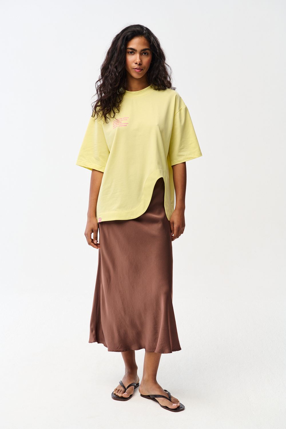 T-shirt Best Decisions przyciąga uwagę nie tylko inspirującym napisem, ale przede wszystkim nowoczesnym krojem. Oryginalne rozcięcie na dole przodu dodaje mu lekkości i sprawia, że klasyczna forma zyskuje nowy wymiar. Miękka dzianina w kolorze pastelowej żółci to idealny wybór na cieplejsze dni.