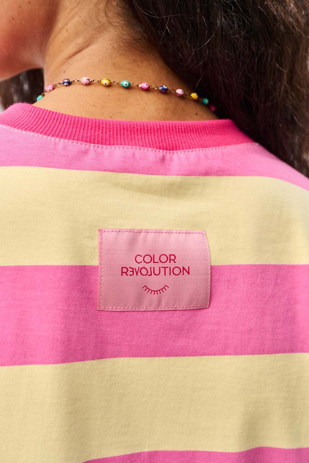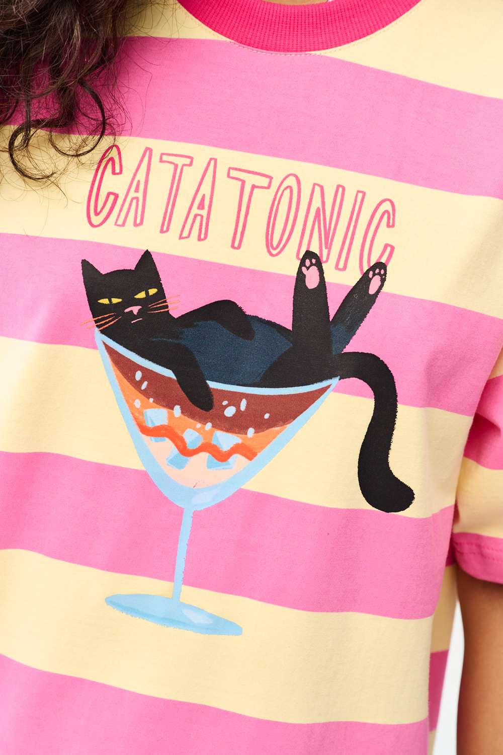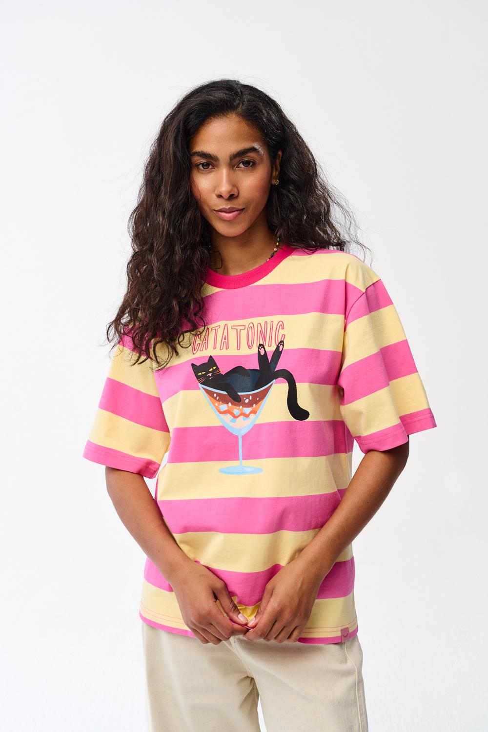 T-shirt Catatonic to połączenie letniej klasyki z odrobiną szaleństwa. Szerokie, poziome pasy w kolorze masła i różu tworzą tło dla zabawnej grafiki z czarnym kotem odpoczywającym w kieliszku. To model, który nie bierze mody zbyt poważnie.