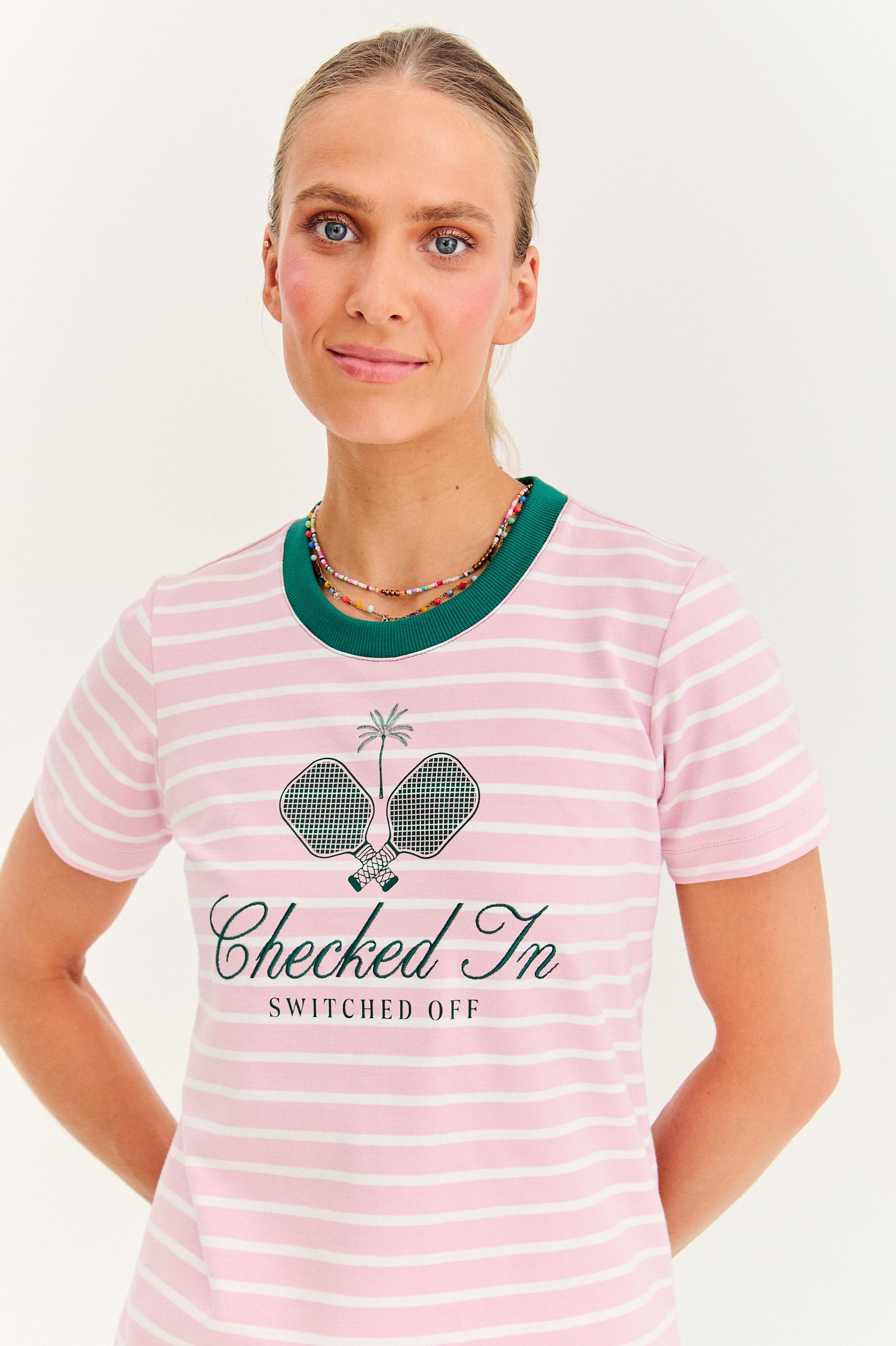 T-shirt Checked In to sportowy luz i letni vibe w jednym. Różowe paski, zielony ściągacz i nadruk z palmą i rakietkami sprawiają, że od razu czujesz klimat wakacyjnego resetu. Haftowany napis „Checked In – switched off" to więcej niż ozdoba – to stan umysłu.