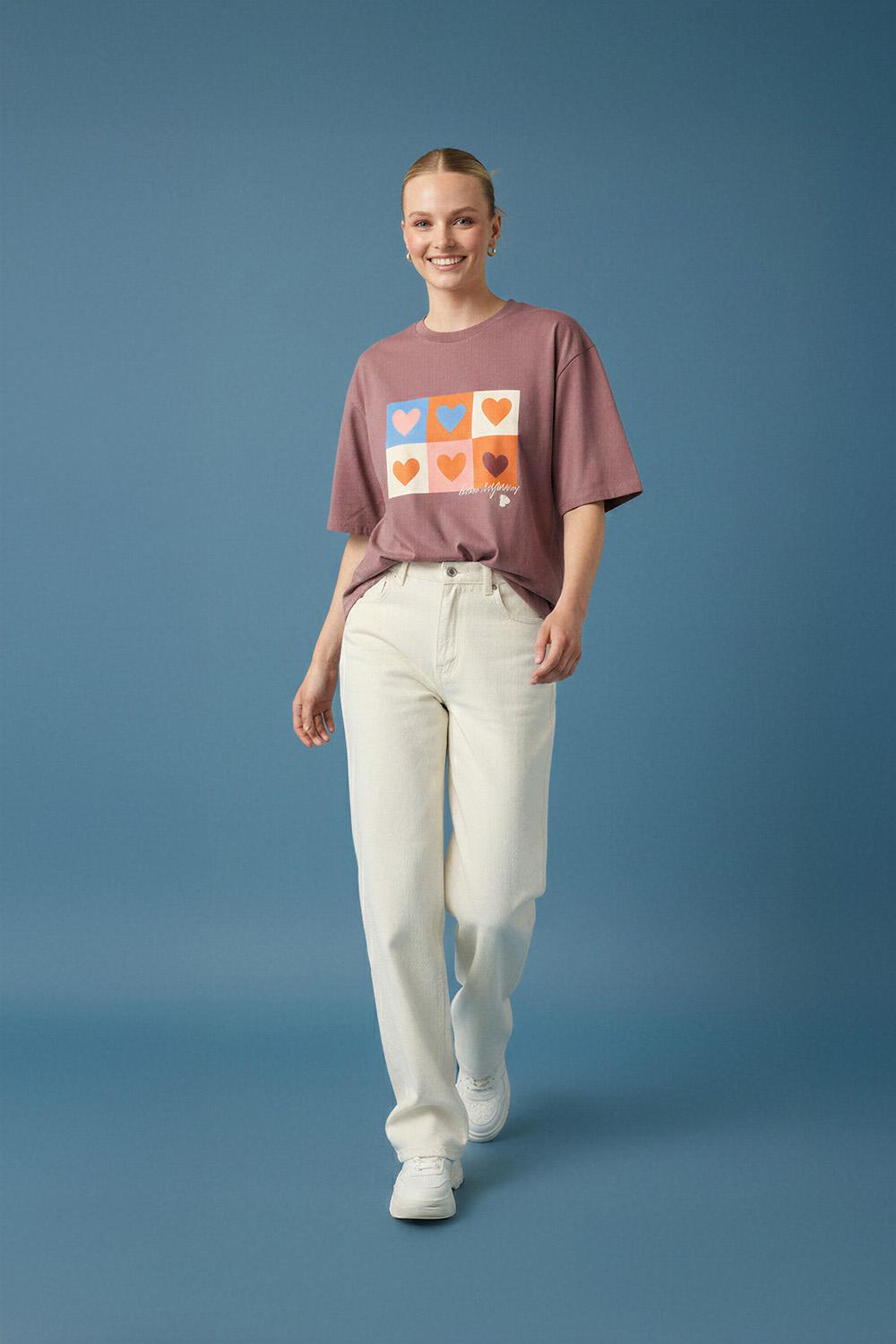 T-shirt Chocolate Love to propozycja dla kobiet, które kochają łączyć modę ze sztuką. Zaprojektowany przez francuską ilustratorkę Claire Iglesias w ramach projektu Naoko x Artist Remix, wyróżnia się głębokim, bakłażanowym odcieniem fioletu i oversize'owym krojem. To idealna baza dla energetycznej grafiki.