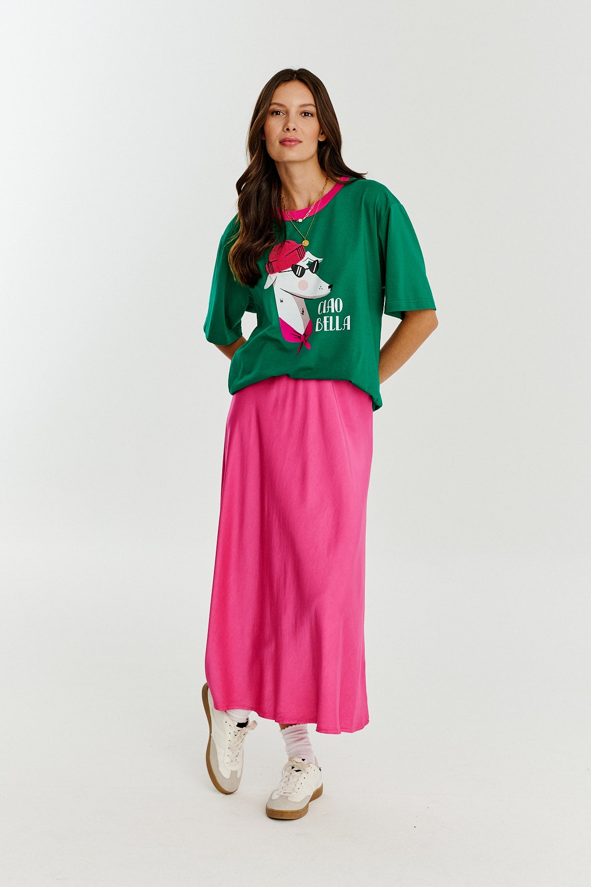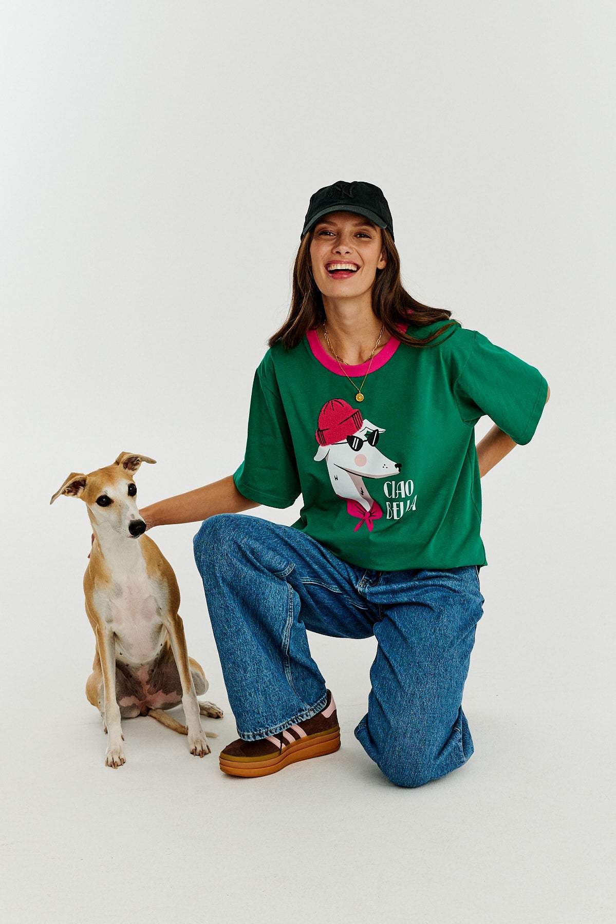 T-shirt Ciao Bella to wyjątkowo urocza i stylowa koszulka, która przyciąga uwagę swoją grafiką. Utrzymana w głębokim zielonym odcieniu, ozdobiona jest zabawną ilustracją psa w czapce i okularach przeciwsłonecznych oraz napisem "Ciao Bella". Fuksjowe akcenty, takie jak obramowanie dekoltu oraz detale na grafice, dodają jej świeżości i wyrazistości.