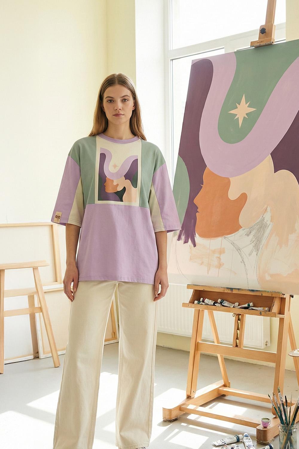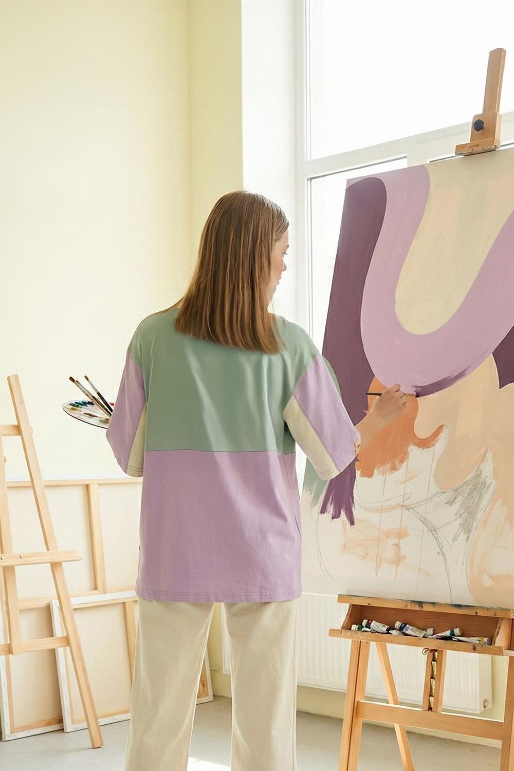 T-shirt Creative Mind to dzieło sztuki, które możesz nosić na co dzień. Zaprojektowany przez Maggie Stephenson w ramach projektu Naoko x Artist Remix, łączy w sobie wygodę kroju oversize z wyrafinowaną estetyką. Geometryczne bloki kolorów – liliowy fiolet, miętowa zieleń i biel – tworzą tło dla abstrakcyjnej grafiki.