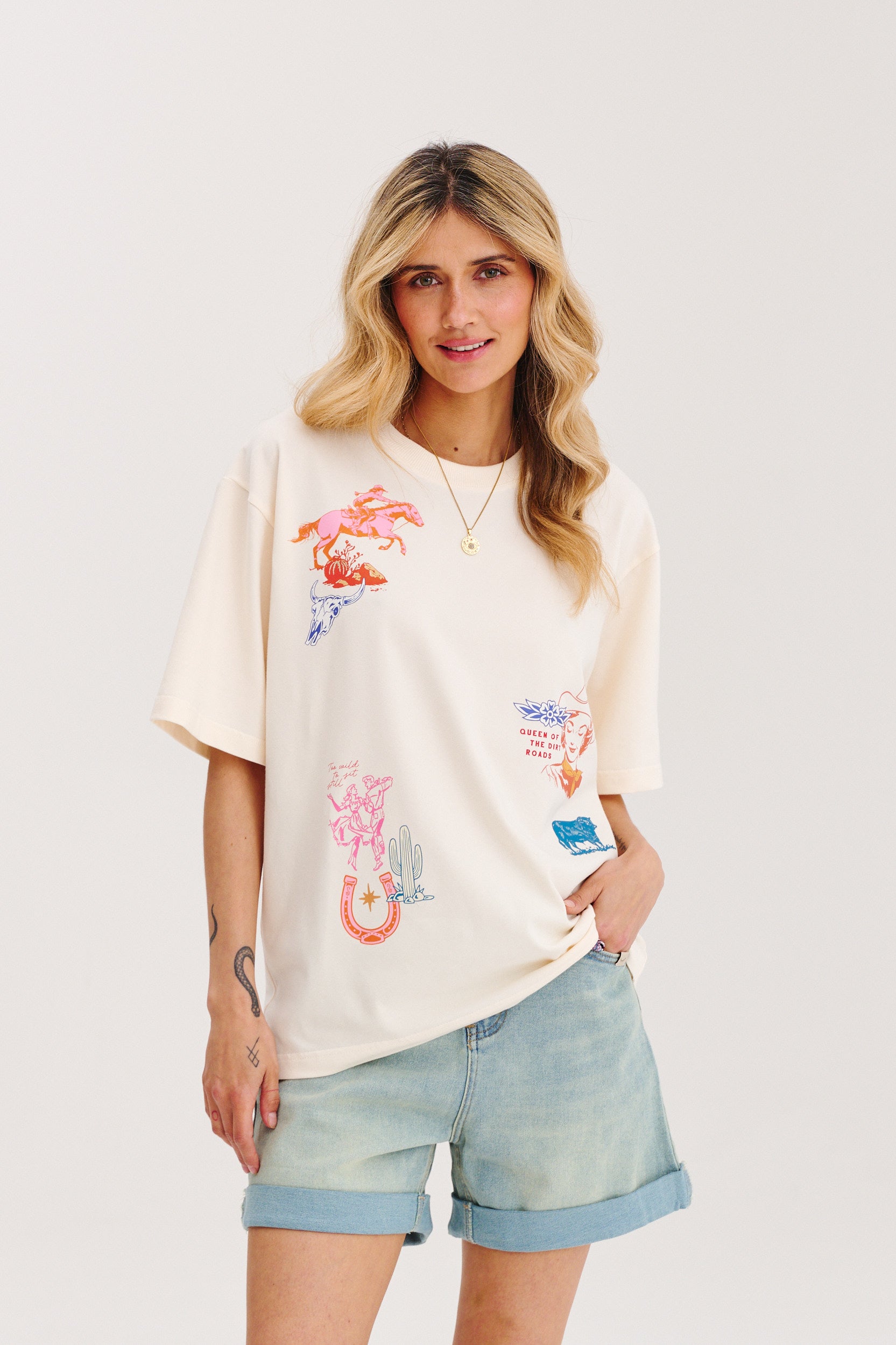 T-shirt Dirt Roads Queen to ukłon w stronę wolności, odwagi i ducha Dzikiego Zachodu. Kolorowe nadruki w stylu rodeo, haftowany detal z kowbojskim butem na rękawie i beżowy odcień tworzą wyjątkowy miks retro i nowoczesnego luzu. Ten t-shirt to prawdziwa gratka dla wszystkich, które kochają wyróżniać się w tłumie – z humorem i dystansem.