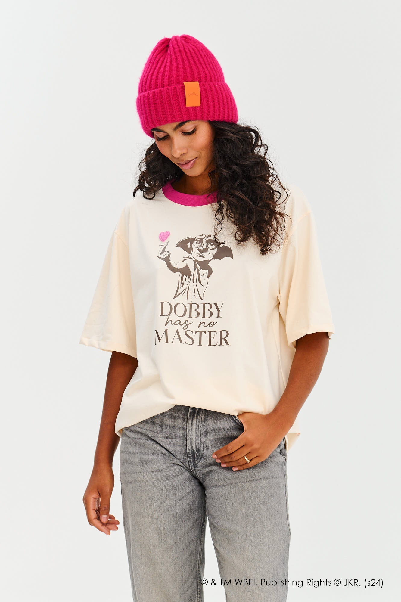 T-shirt Dobby Is Free to wyjątkowa koszulka celebrująca wolność i niezależność ukochanego Zgredka z serii Harry Potter. Utrzymana w jasnym odcieniu, z kontrastowym, różowym wykończeniem przy dekolcie, koszulka na przodzie prezentuje wizerunek Dobby’ego z serduszkiem wykonanym metodą chenille oraz napis Dobby has no master. Na plecach umieszczono napis Dobby is free z różową grafiką skarpetki.