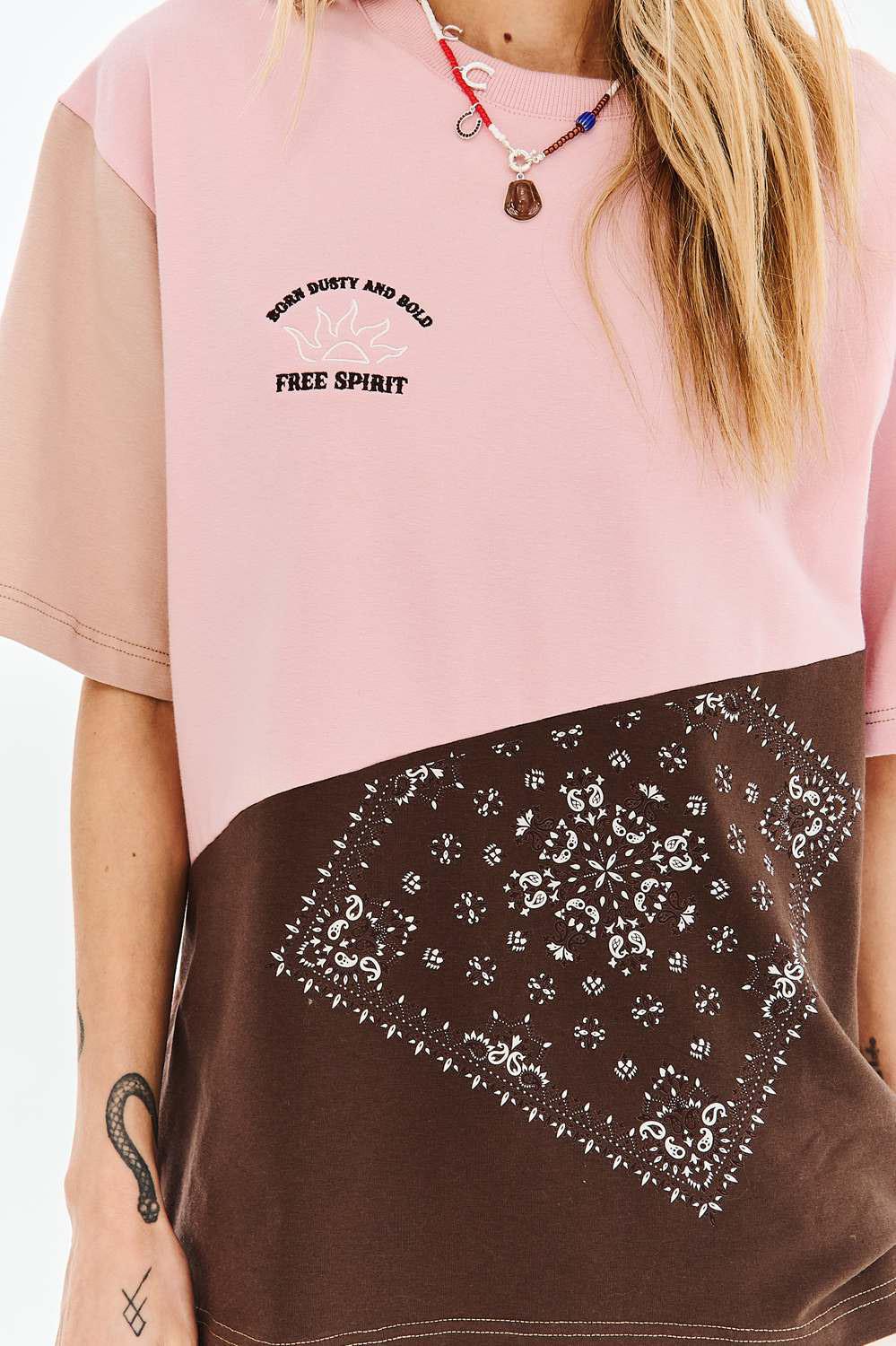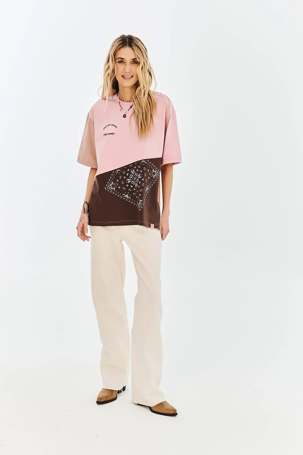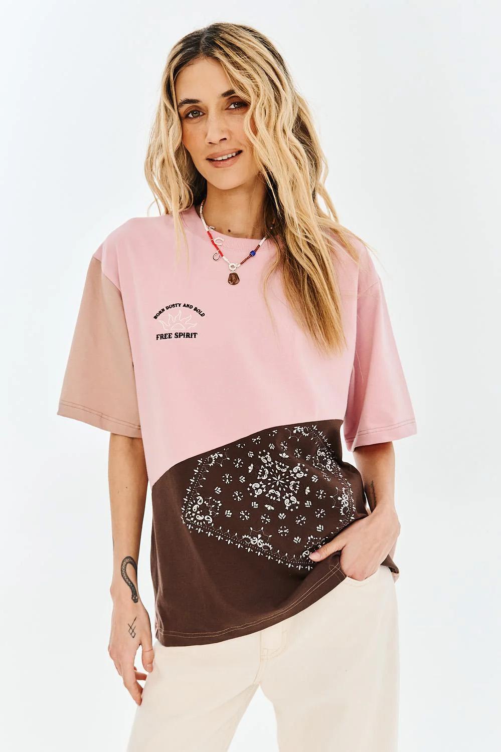 T-shirt Dusty Spirit to propozycja dla marzycielek i wolnych duchów. Nieoczywiste połączenie brudnego różu z głębokim brązem oraz nadrukiem typu bandana tworzy unikatową całość. Haftowany napis „Free Spirit” oraz subtelne grafiki słońca nadają mu artystycznego wyrazu.