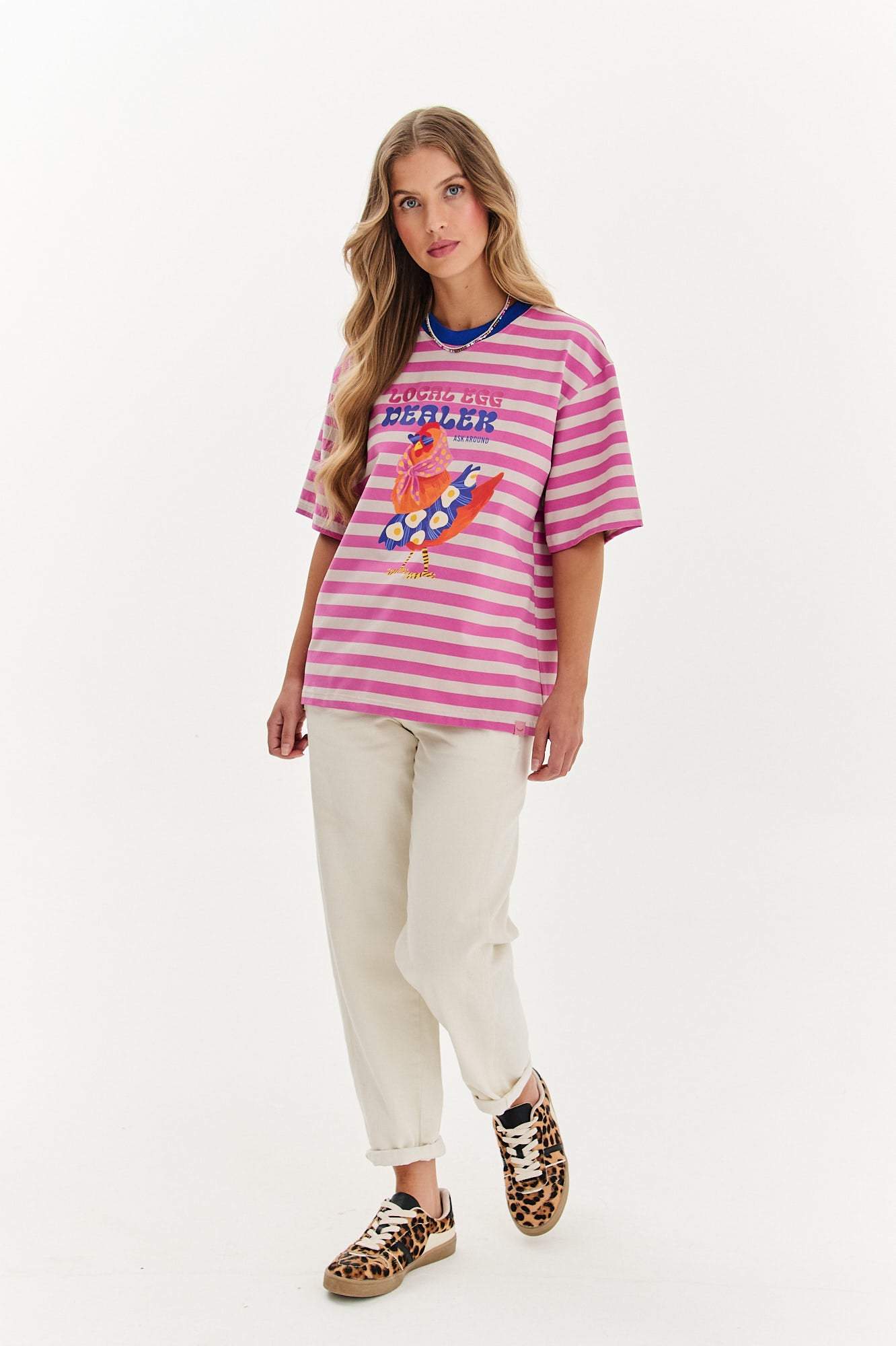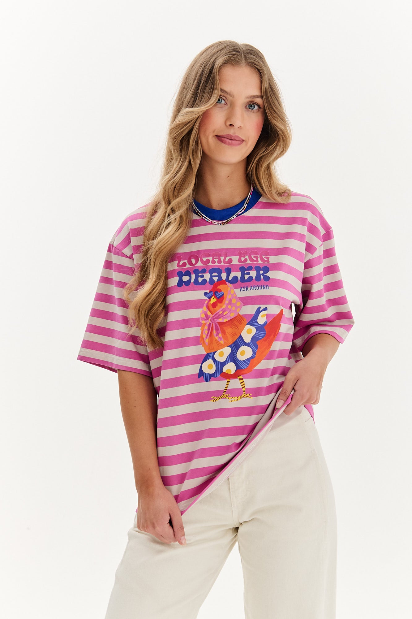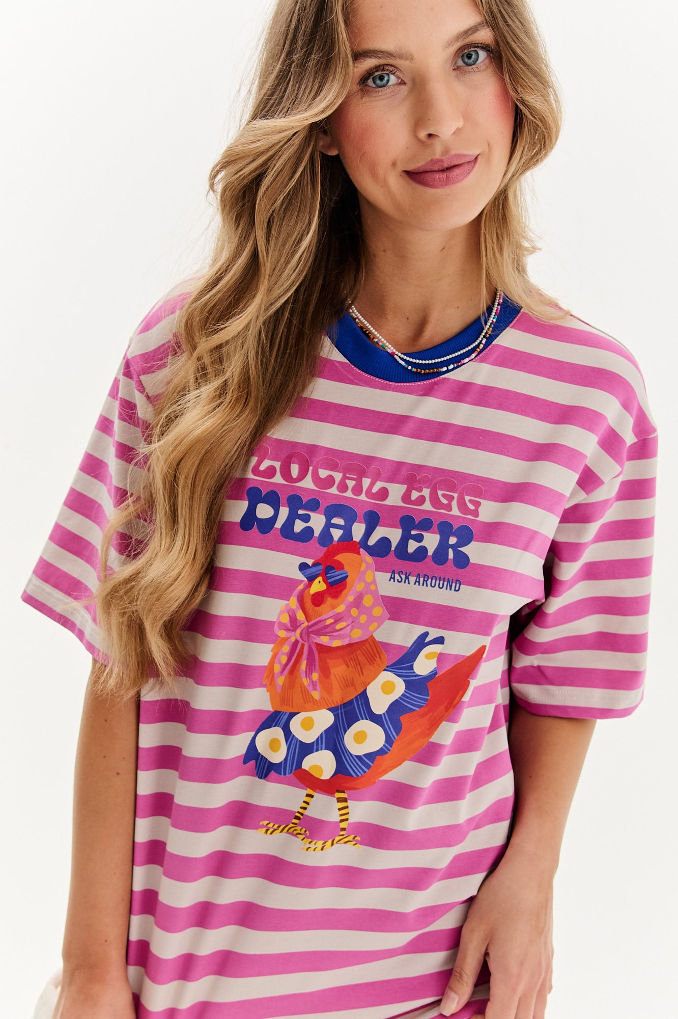 T-shirt Egg Dealer to połączenie pastelowego uroku z wyrazistym żartem. Na froncie króluje bohaterka w chustce i spódnicy w jajka oraz napis „Local egg dealer – ask around", który nie pozwala przejść obojętnie. Całość dopełniają różowo-fioletowe paski i kontrastowy dekolt.