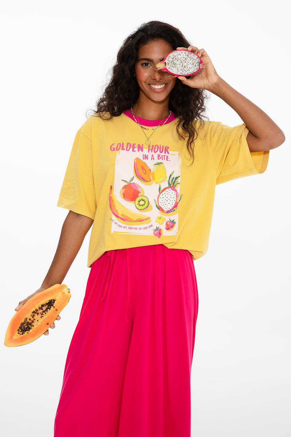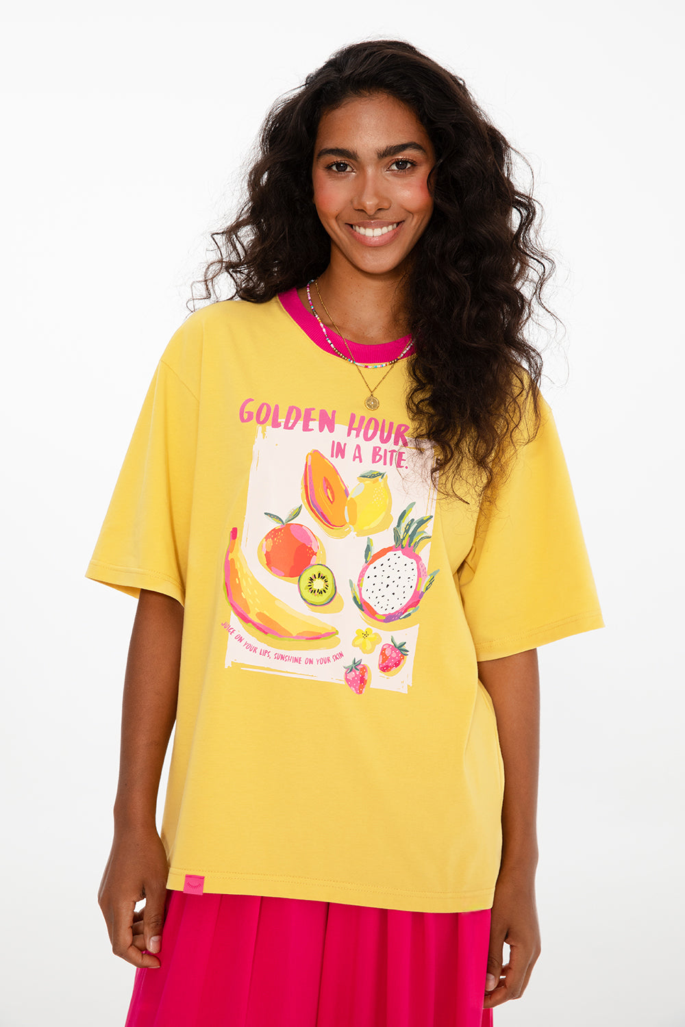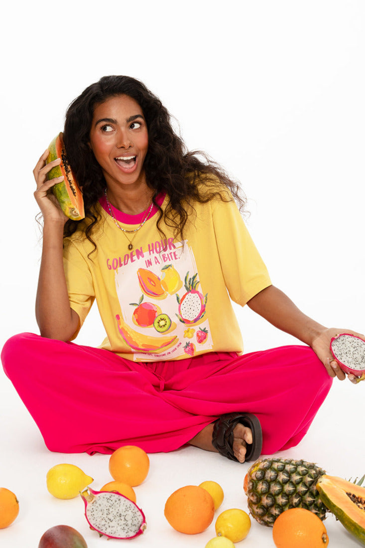 T-shirt Golden Hour to ubraniowy ekwiwalent najpiękniejszego momentu dnia – ciepłego światła, owocowej eksplozji i wakacyjnego vibe'u. Soczysty nadruk z tropikalnymi owocami i napisem „Golden hour in a bite" zamienia zwykły dzień w letnie święto.