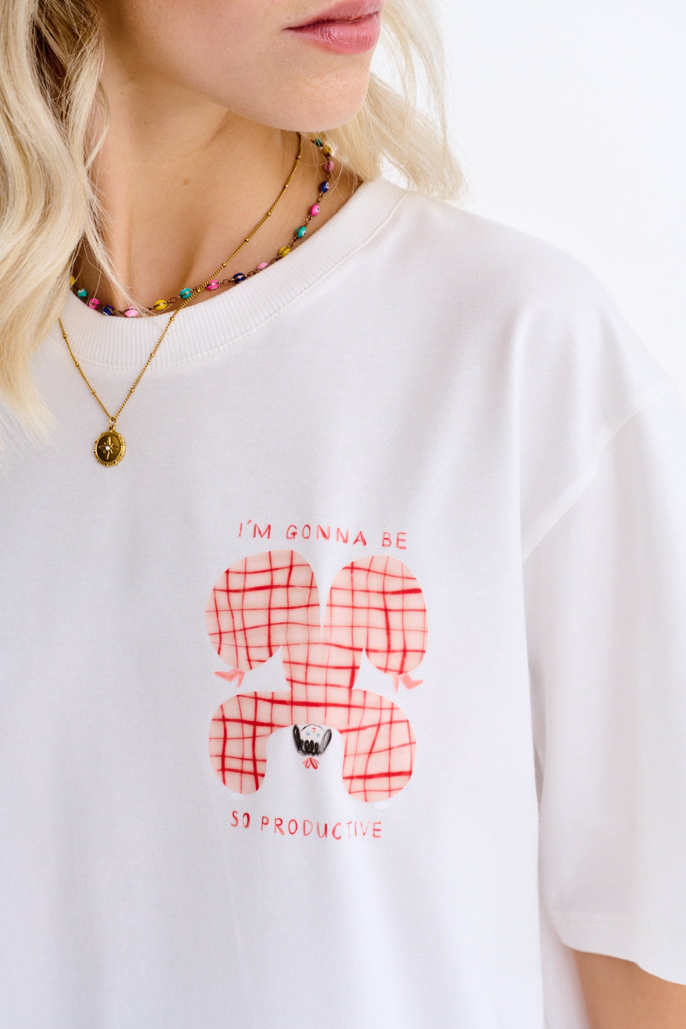 Na piersi znajduje się subtelny nadruk "I'm gonna be so productive", a na plecach duża ilustracja postaci chowającej się pod kołdrą z hasłem "Maybe if I don't move Monday won't see me". To odpowiedź na pytanie o to, co chcemy pielęgnować: akceptację własnych nastrojów i prawo do odpoczynku. Wybierając ten model, wspierasz Fundację Kosmos dla Dziewczynek.