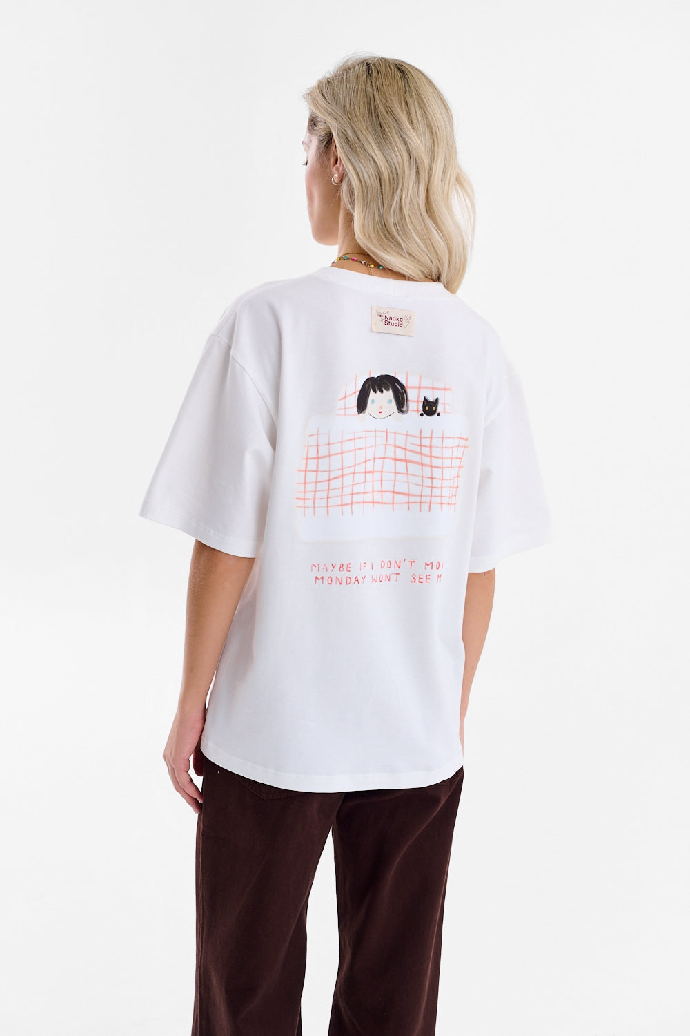 T-shirt Hide from Monday to humorystyczna propozycja od Kit Agar, przypominająca o prawie do gorszego dnia i regeneracji. W ramach projektu Naoko x Artist Remix, brytyjska artystka stworzyła koszulkę, która z przymrużeniem oka traktuje początek tygodnia. Klasyczna biel oversize'owego T-shirtu stanowi tło dla uroczej grafiki.