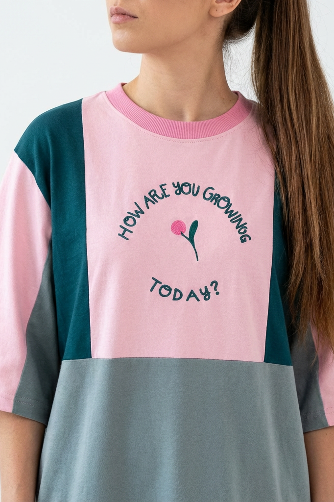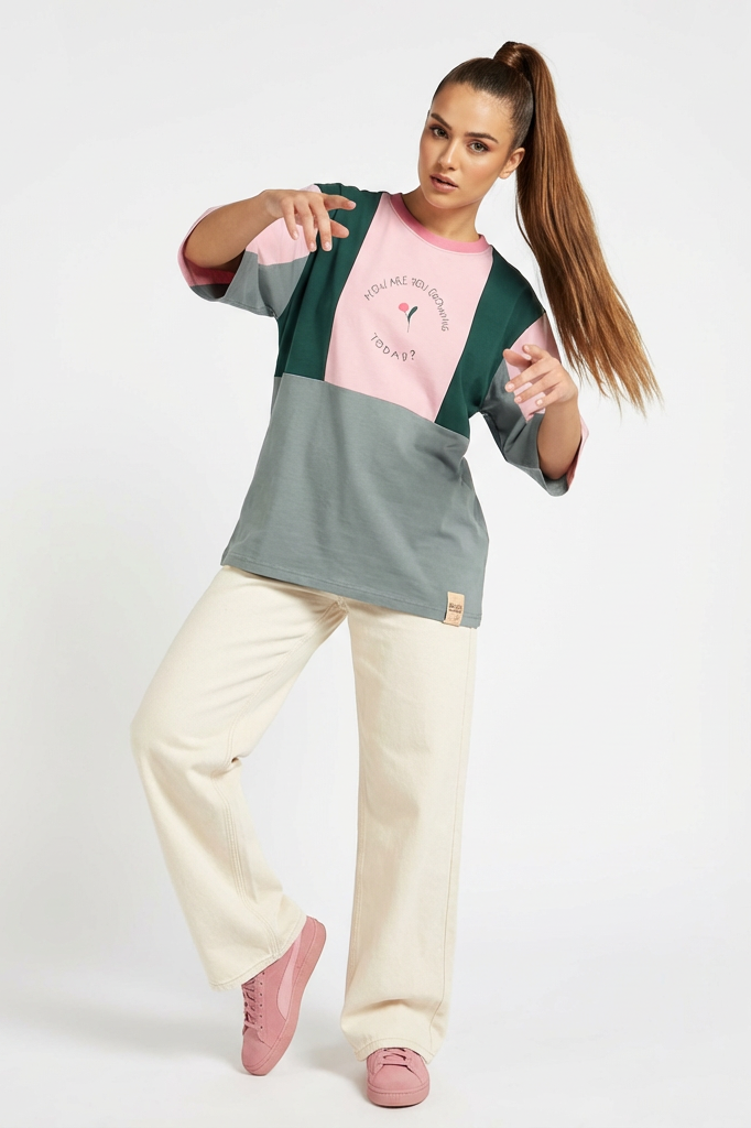 T-shirt How Are You to czułe przypomnienie o tym, co w życiu najważniejsze. Zaprojektowany przez Loveis Wise w ramach projektu Naoko x Artist Remix, łączy w sobie miękkość pasteli z głęboką zielenią. Oversize'owy krój i kolorowe panele tworzą harmonijną, przyjazną całość.