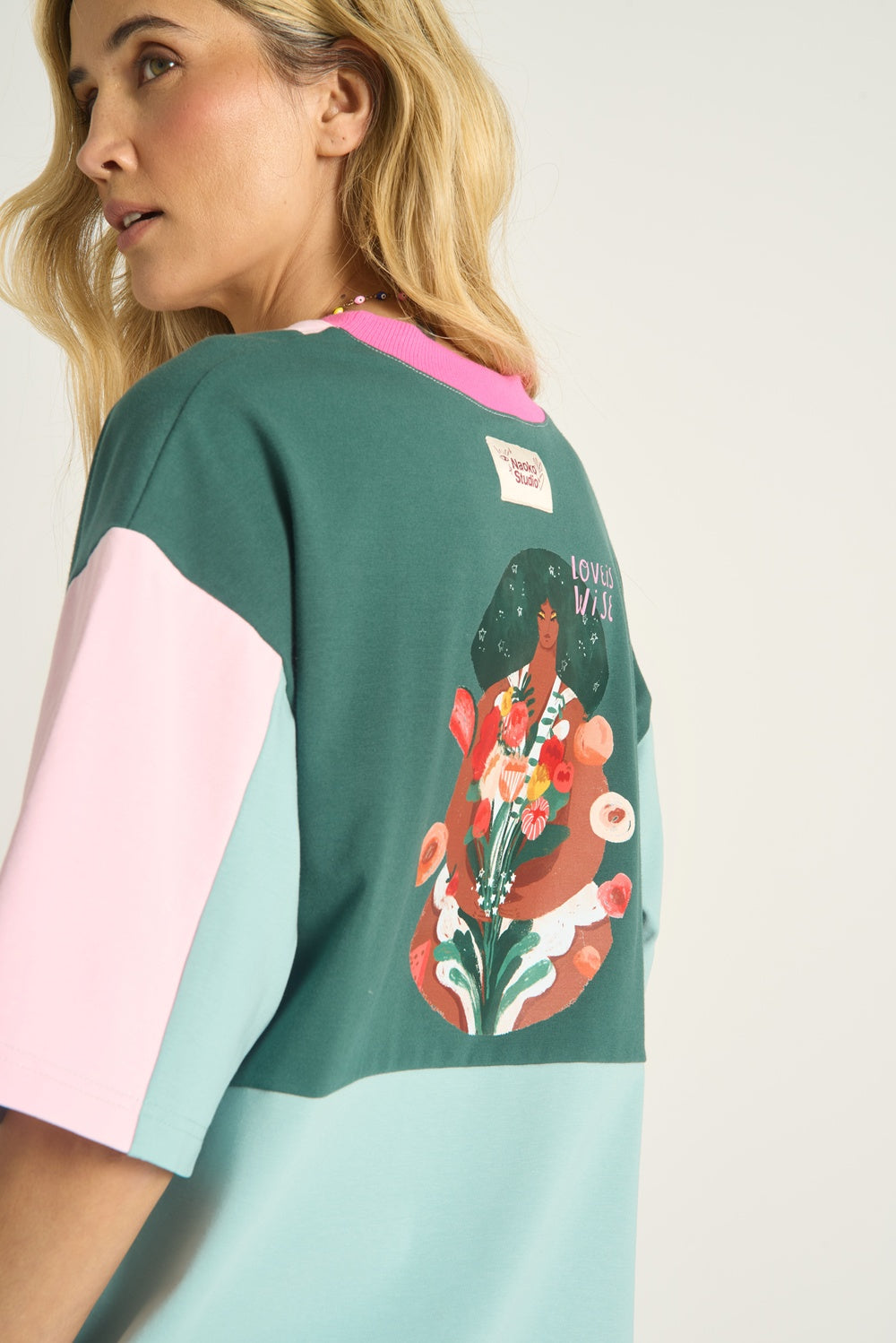 T-shirt How Are You to czułe przypomnienie o tym, co w życiu najważniejsze. Zaprojektowany przez Loveis Wise w ramach projektu Naoko x Artist Remix, łączy w sobie miękkość pasteli z głęboką zielenią. Oversize'owy krój i kolorowe panele tworzą harmonijną, przyjazną całość.