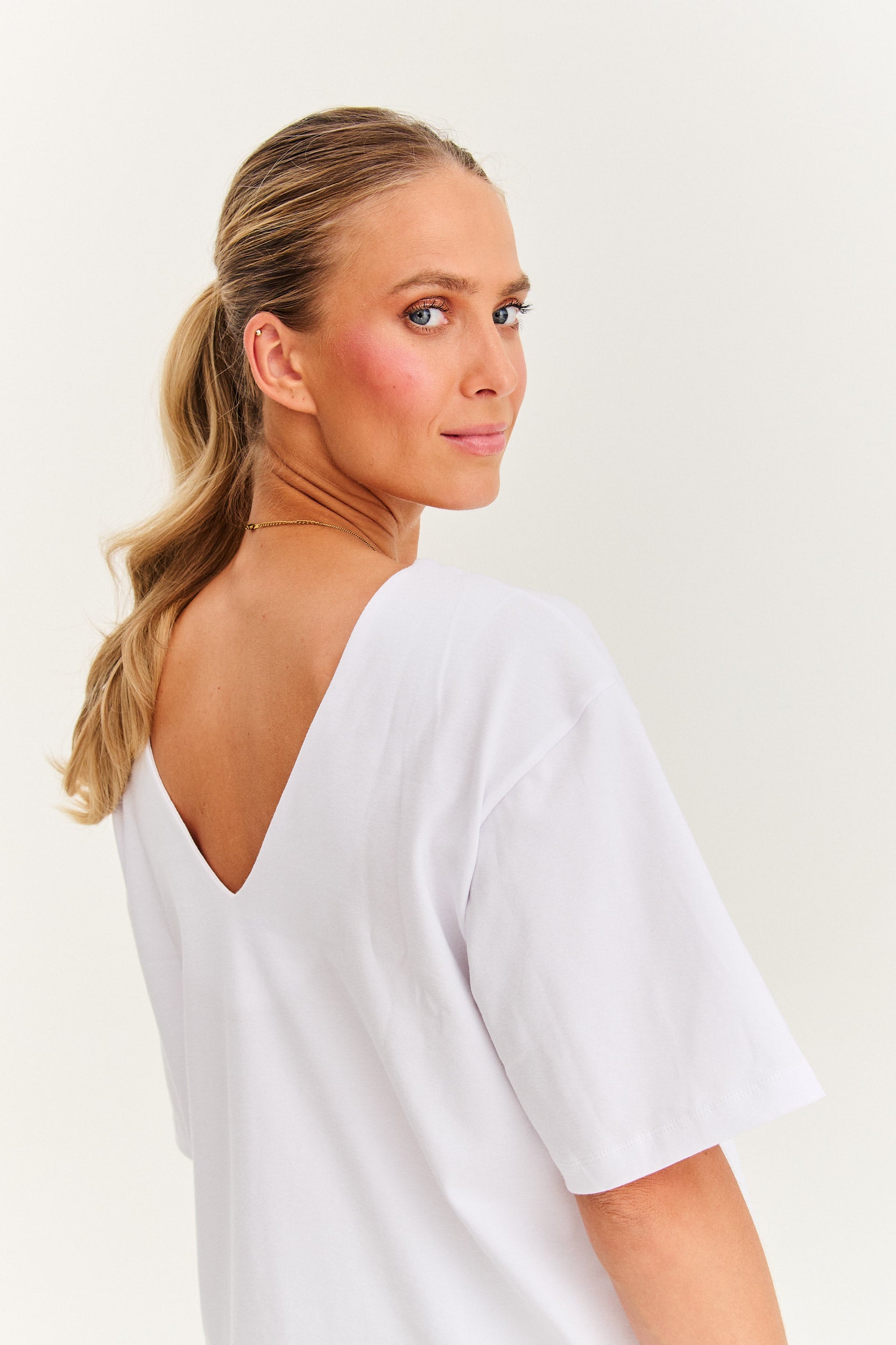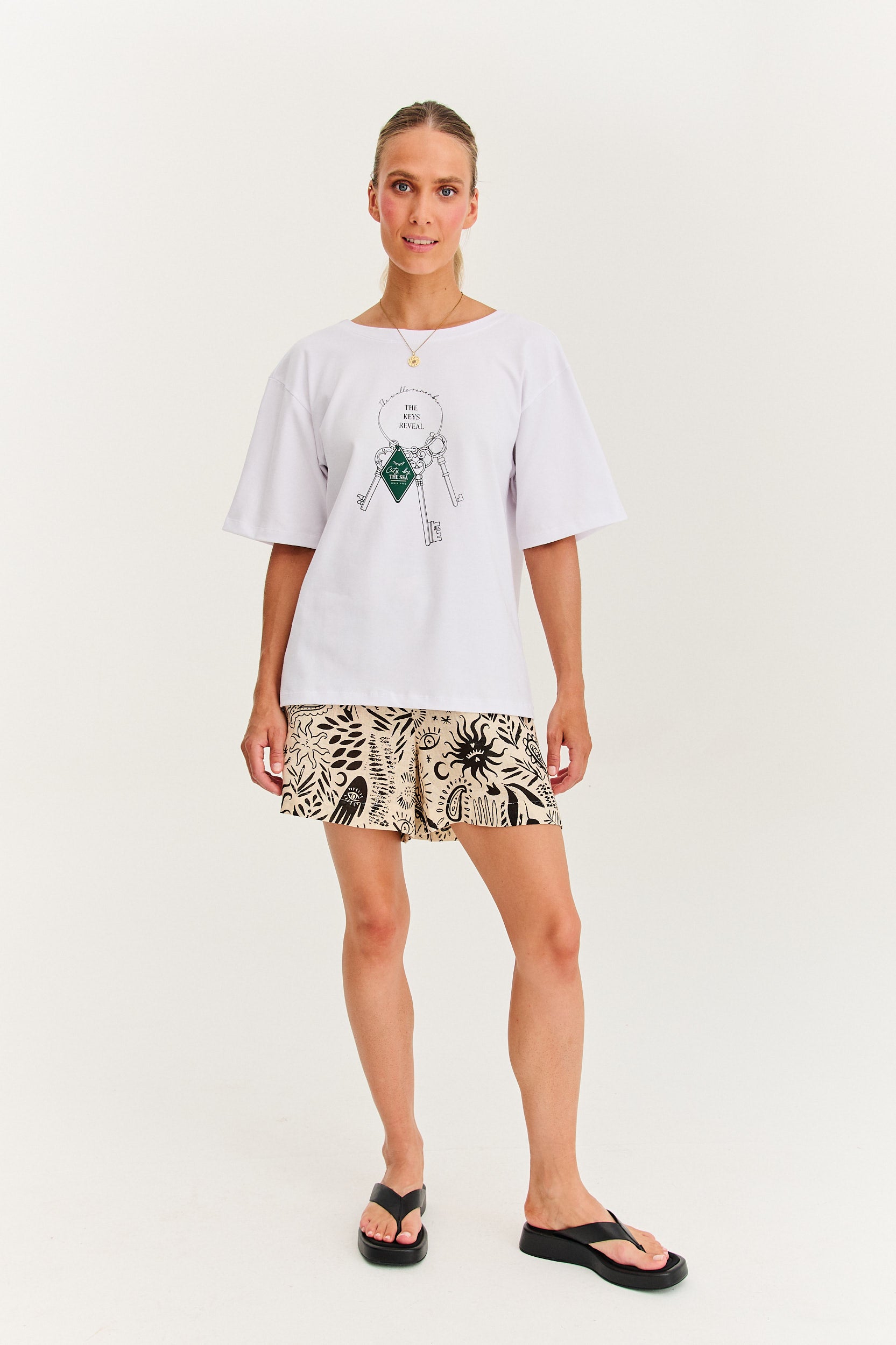 T-shirt Secret Code to minimalistyczna koszulka z nutą tajemnicy. Na pierwszy rzut oka – prosty krój i głęboki dekolt w serek z tyłu. Z przodu jednak czeka coś więcej – haftowany pęk kluczy i breloczek z hasłem "THE KEYS REVEAL" to detal, który przyciąga wzrok i intryguje.