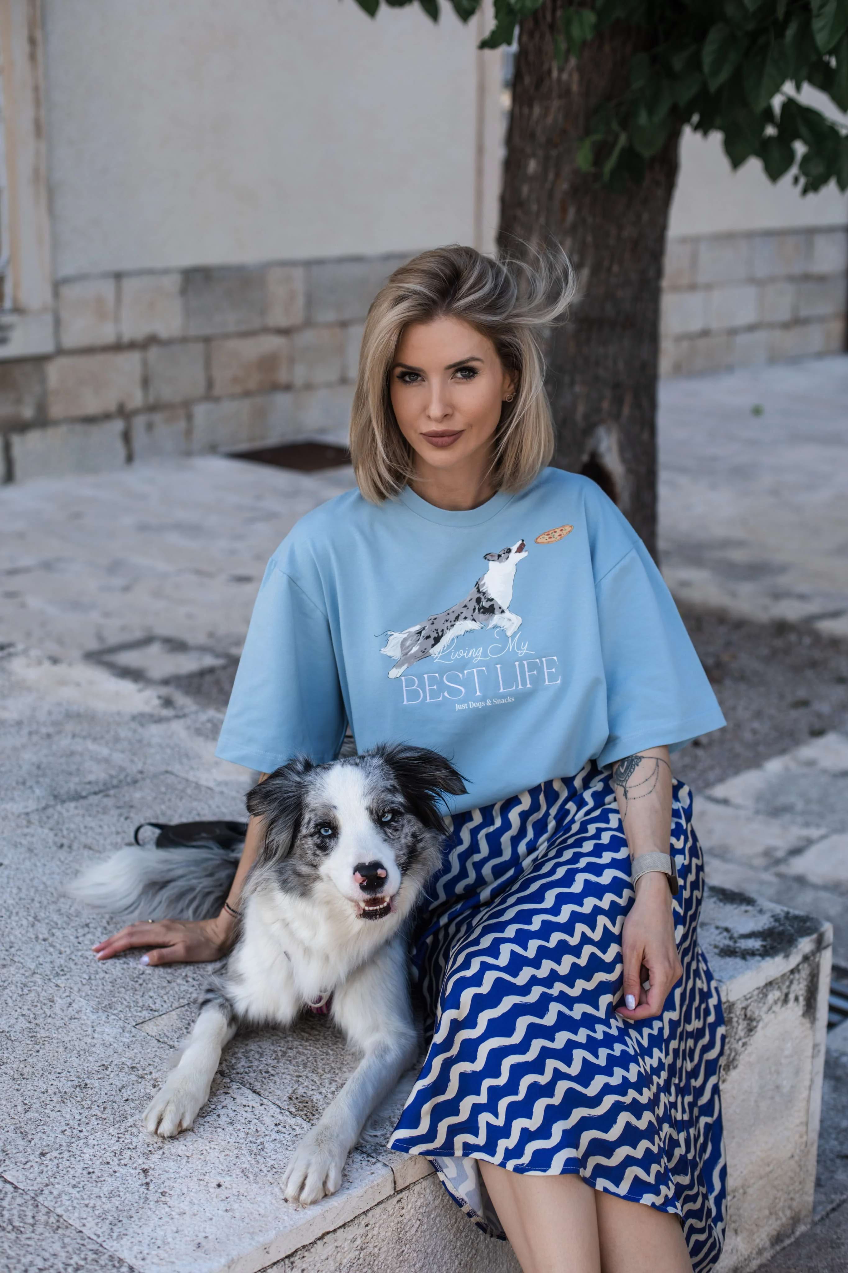 T-shirt My Best Life to manifest wakacyjnego luzu i miłości do zwierzaków. Na błękitnym tle pojawia się rozkoszny piesek cieszący się życiem, a napis „Loving My Best Life” mówi wszystko – to koszulka na dni, kiedy chcesz po prostu być sobą i cieszyć się chwilą.