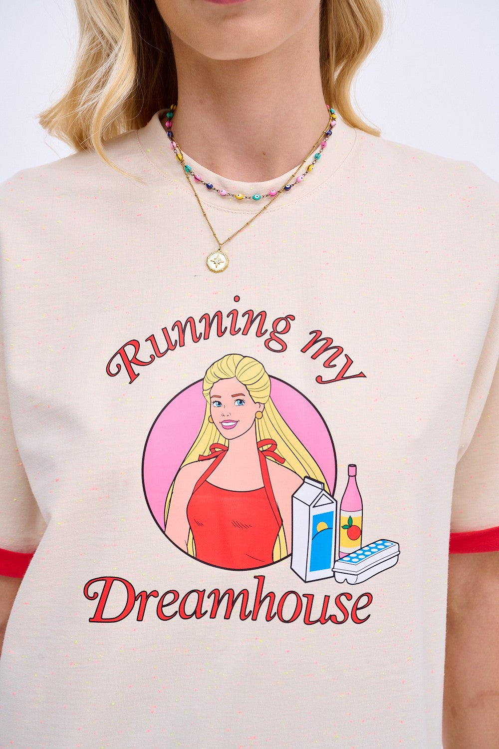 T-shirt My Dreamhouse to nostalgiczna podróż w świat dziecięcych zabaw. Wykonany z miękkiej bawełny w stonowanym kolorze sprawdzi się w wielu stylizacjach. Kontrastowe lamówki przy rękawkach i dekolcie nadają mu charakteru retro.