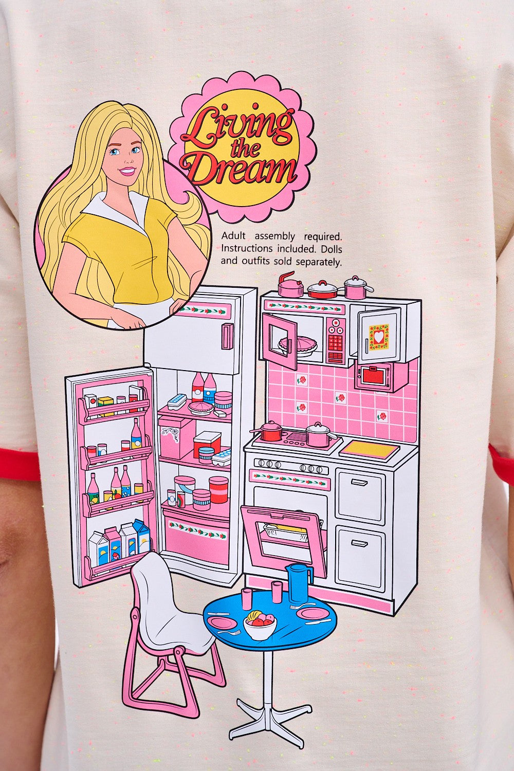 Główną ozdobą T-shirtu są duże, kolorowe nadruki w kreskówkowym stylu. Z przodu znajdziesz uroczą postać Barbie™, a na plecach grafikę, która przywoła nostalgię. To idealny wybór do jeansów z wysokim stanem lub szortów.