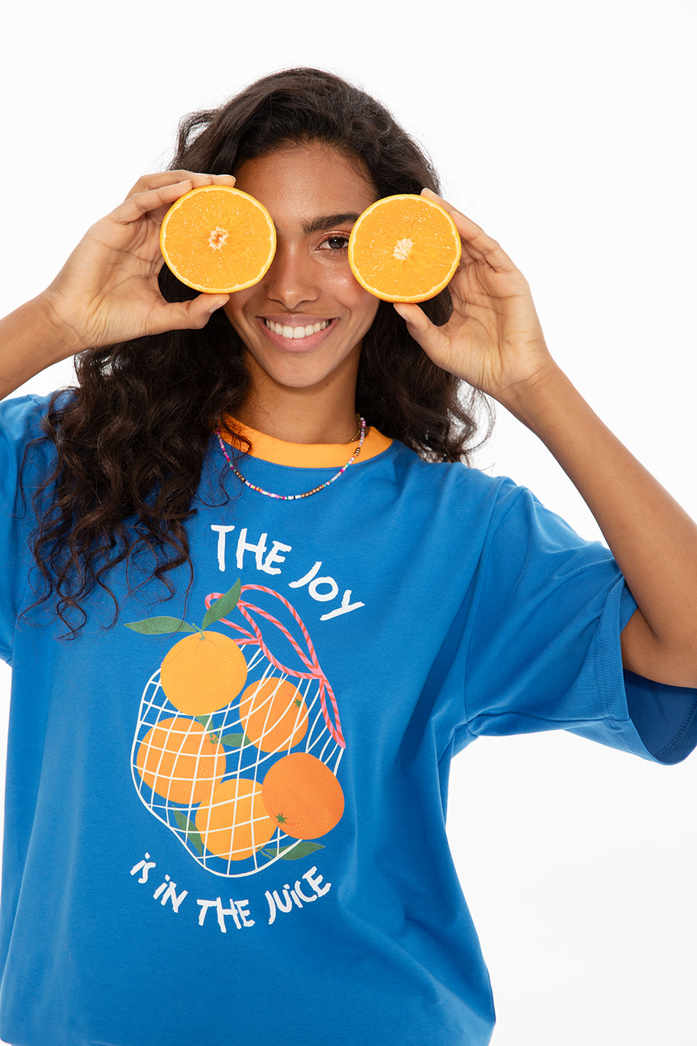 T-shirt Orange Joy to porcja letniego słońca zamknięta w kolorze i haśle: The joy is in the juice. Główna grafika przedstawia siatkę pełną soczystych pomarańczy — symbol beztroski, luzu i radości z małych rzeczy.