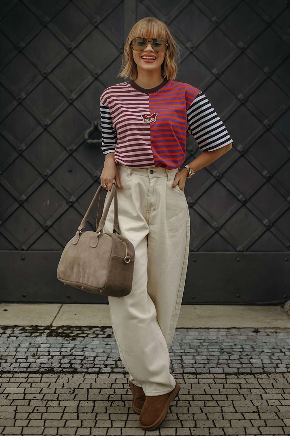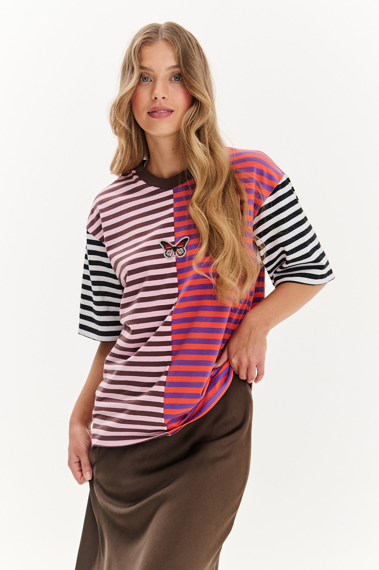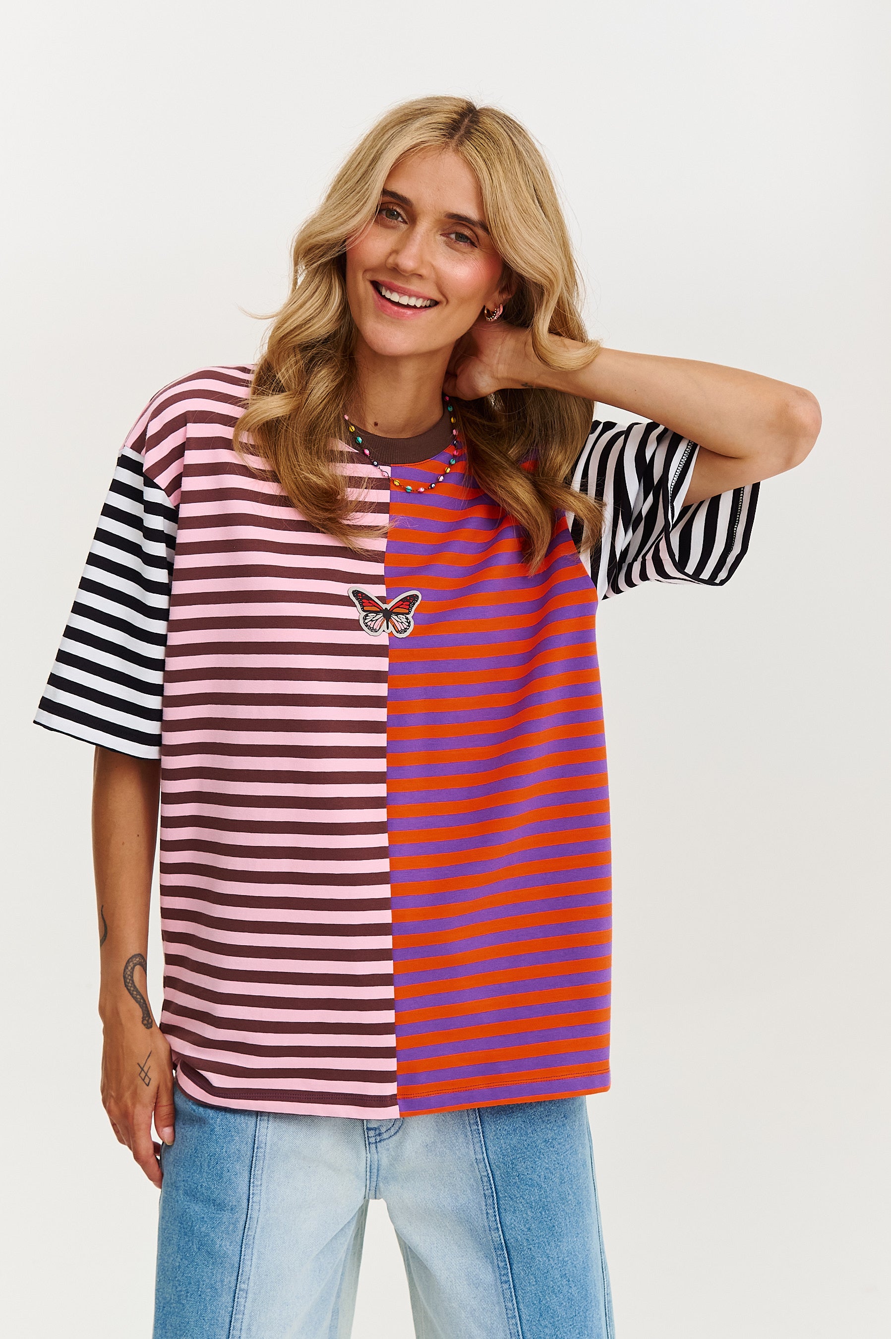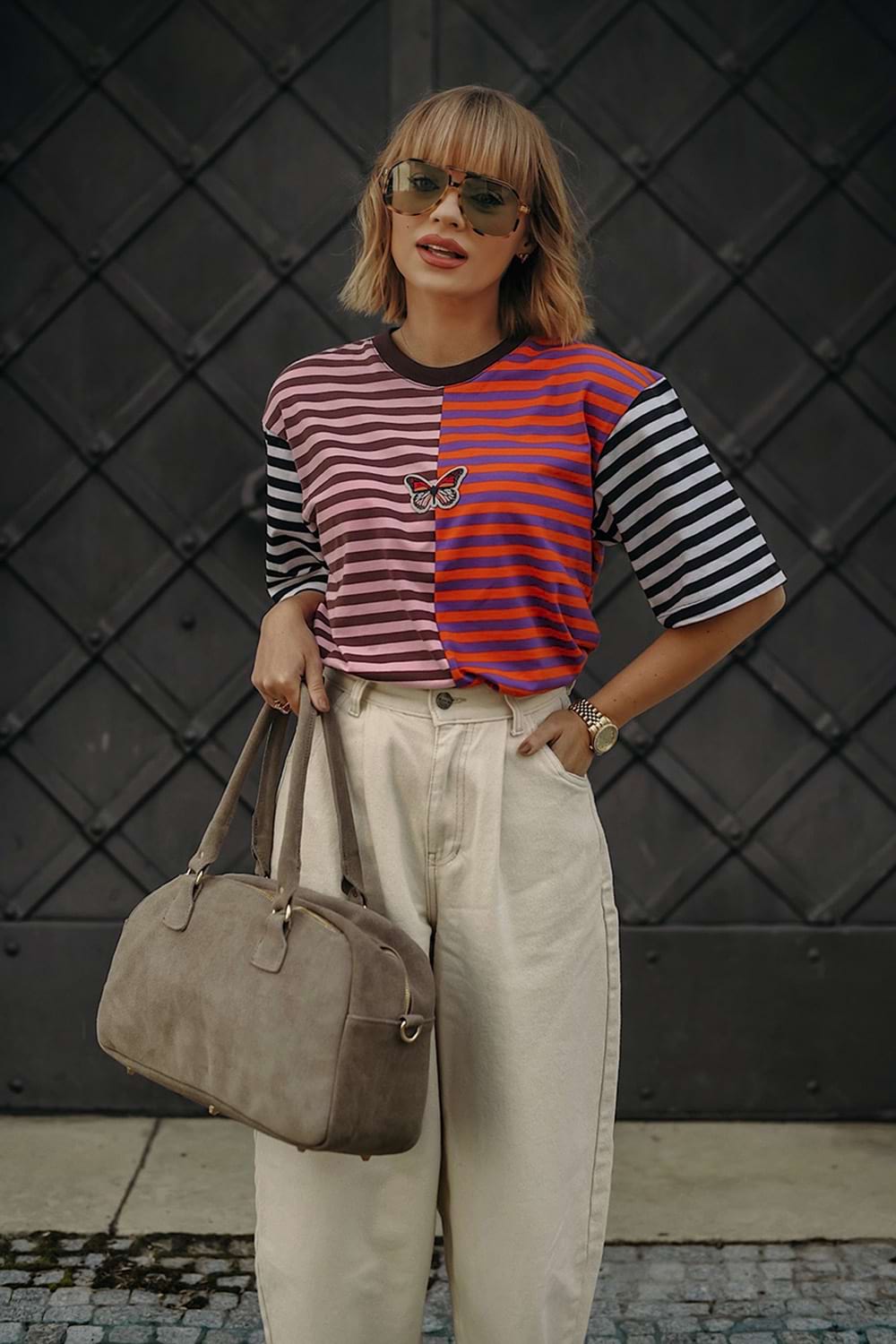 Prosty krój t-shirtu został przełamany graficzną zabawą kolorami i paskami. To idealna opcja dla tych, którzy lubią bawić się modą i szukają czegoś więcej niż klasyki – T-shirt Painted Wings to manifest kreatywności.