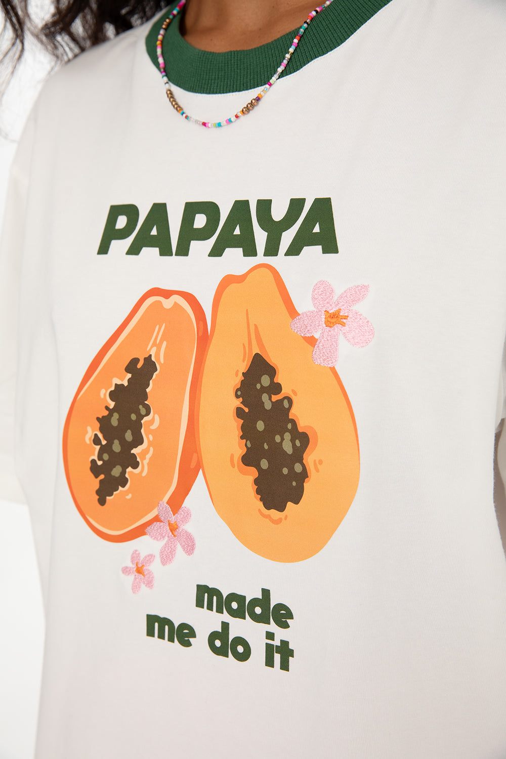 T-shirt Papaya Trouble to humorystyczny manifest wakacyjnego luzu i tropikalnej beztroski. Z hasłem Papaya made me do it i ilustracją soczystej papai, ten t-shirt mówi jedno: nie biorę życia zbyt serio, ale zawsze z uśmiechem.