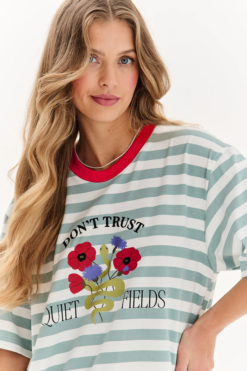T-shirt Quiet Fields – z pozoru spokojna łąka skrywa coś więcej – grafika z polnymi kwiatami i wijącym się wśród nich wężem przypomina, by nie ufać zbyt cichym miejscom. Ten T-shirt w paski to połączenie natury z niepokojącą nutą i charakterystycznym haftem „Don't trust quiet fields".