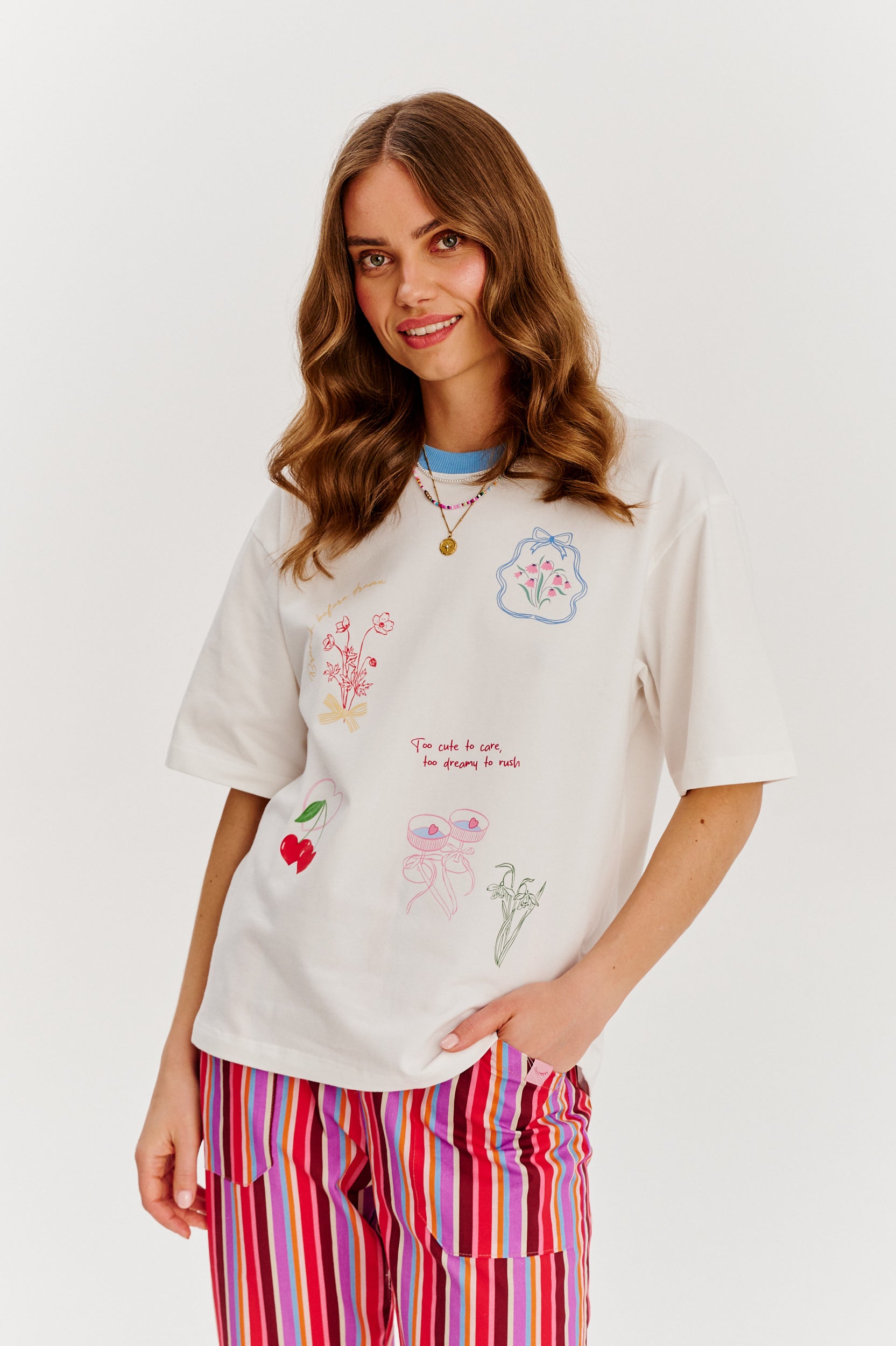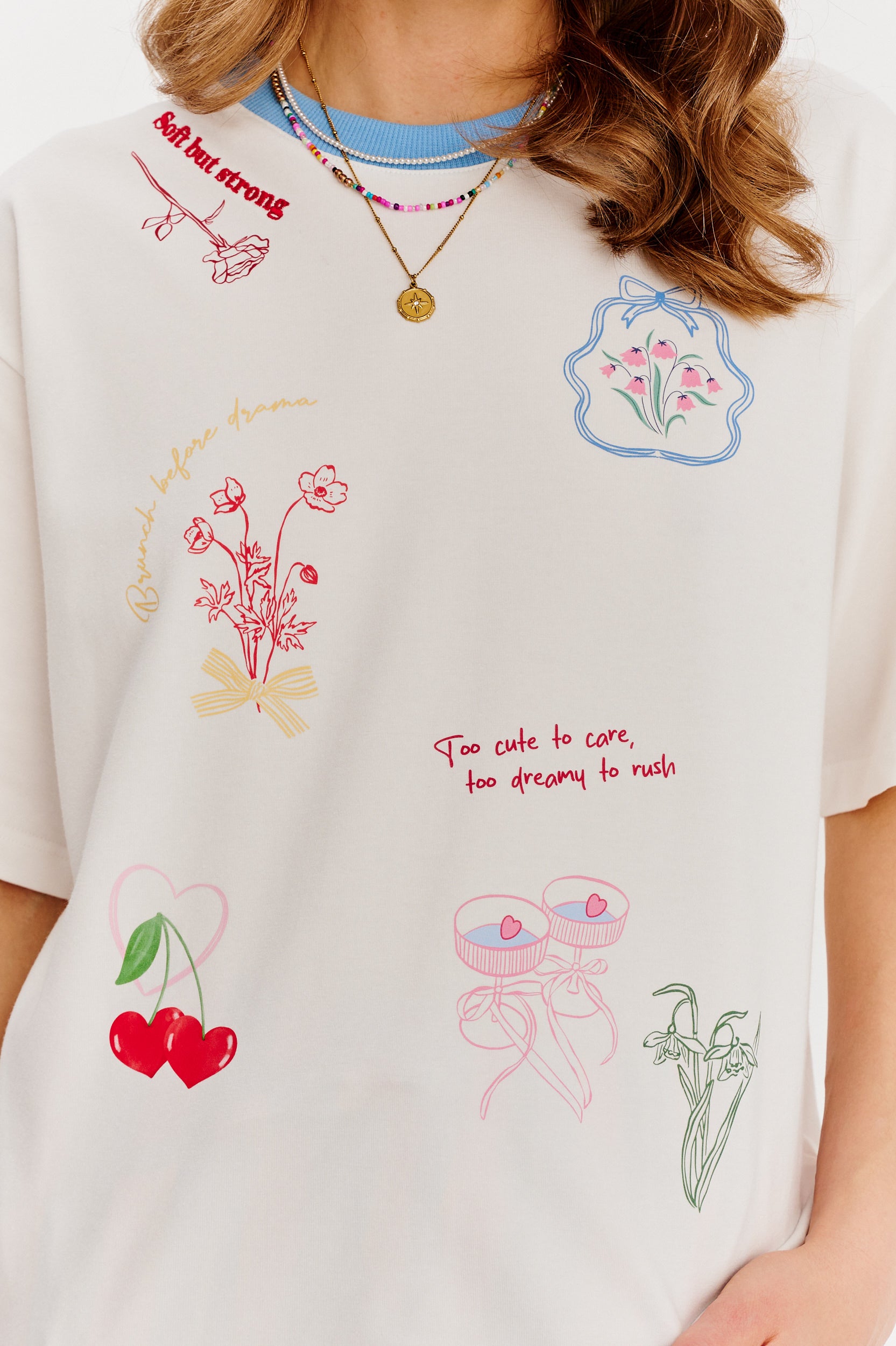 Delikatność i siła – możesz mieć je obie. T-shirt Softly Strong to wyjątkowa kompozycja ilustracji, które mówią więcej niż tysiąc słów. Kwiaty, kokardy, słodkie symbole i hasła o wielkiej mocy tworzą wspólnie opowieść o wrażliwości, którą warto celebrować, nie ukrywać.