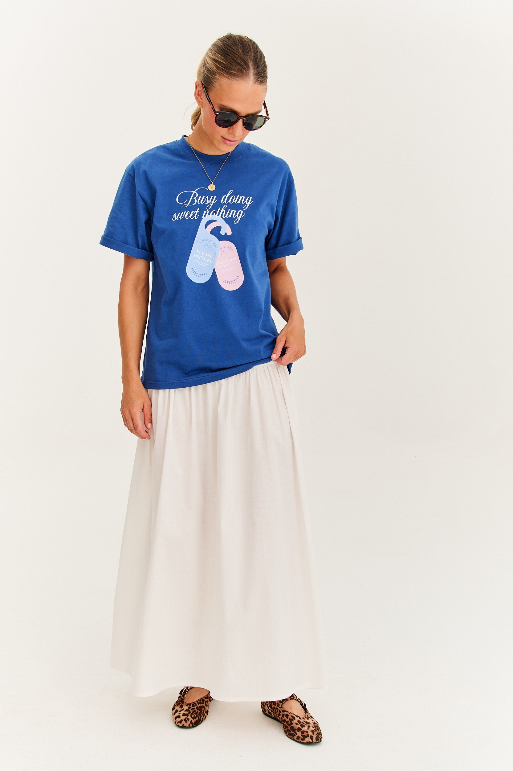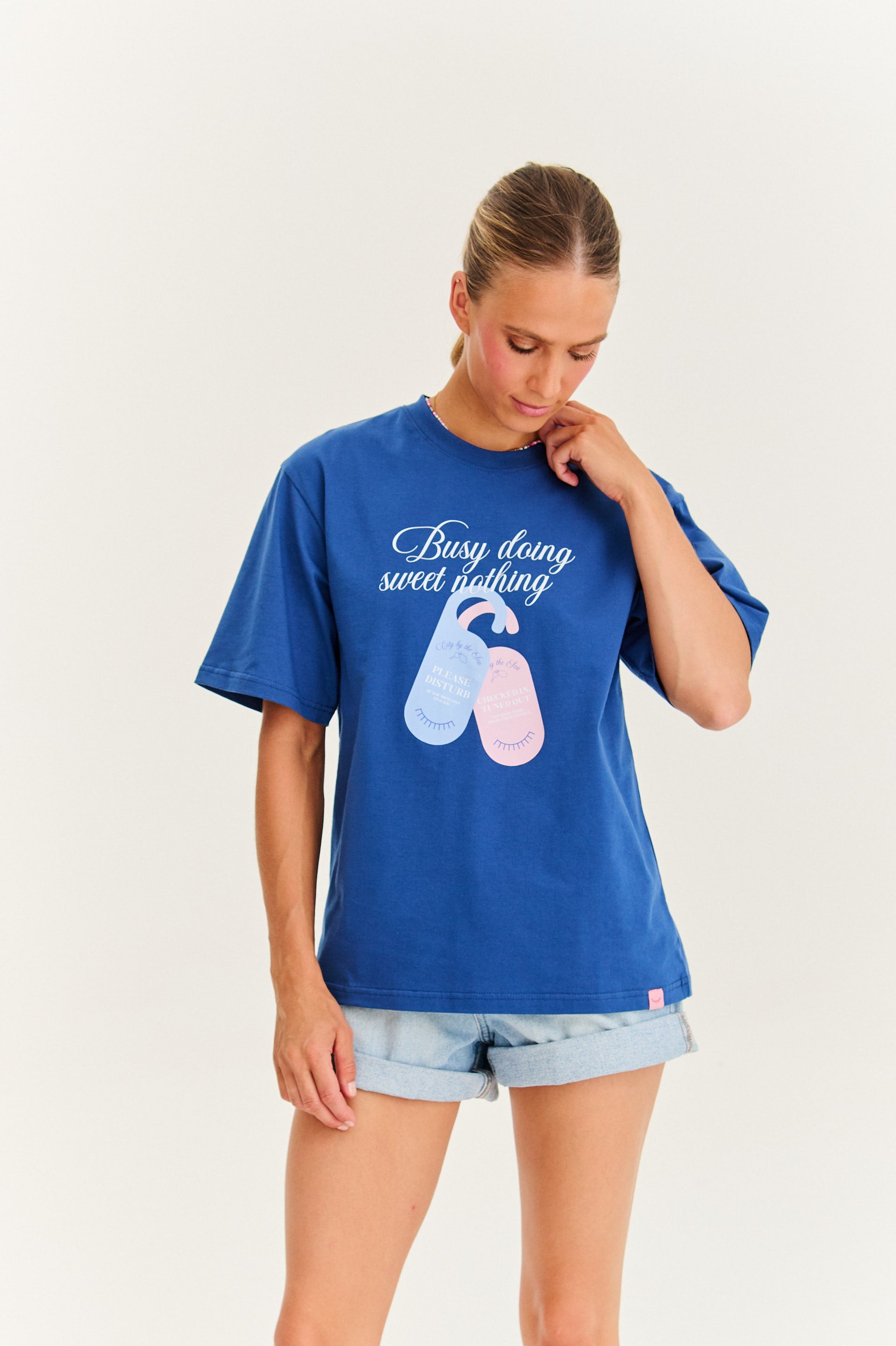 Klasyczny fason, mocny niebieski kolor i lekko żartobliwa grafika to idealne trio na dzień offline. Noś ją do ulubionych jeansów, na wakacjach, w domowym zaciszu albo wtedy, gdy po prostu... chcesz odetchnąć.