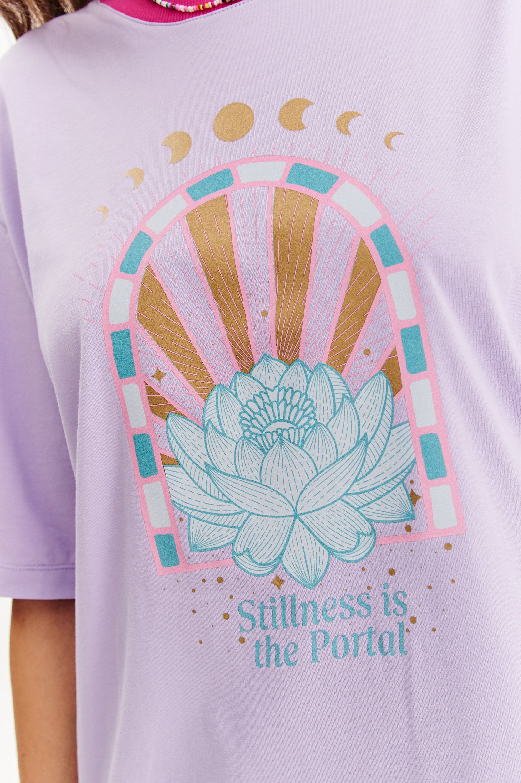 T-shirt The Portal to subtelna propozycja dla marzycielek, które szukają spokoju i harmonii w codziennym chaosie. Liliowy odcień koszulki pięknie współgra z magiczną grafiką przedstawiającą lotos i promienie słońca, otoczone fazami księżyca oraz napisem „Stillness is the Portal". Całość tworzy kompozycję, która przenosi myśli do świata wewnętrznej równowagi i uważności.