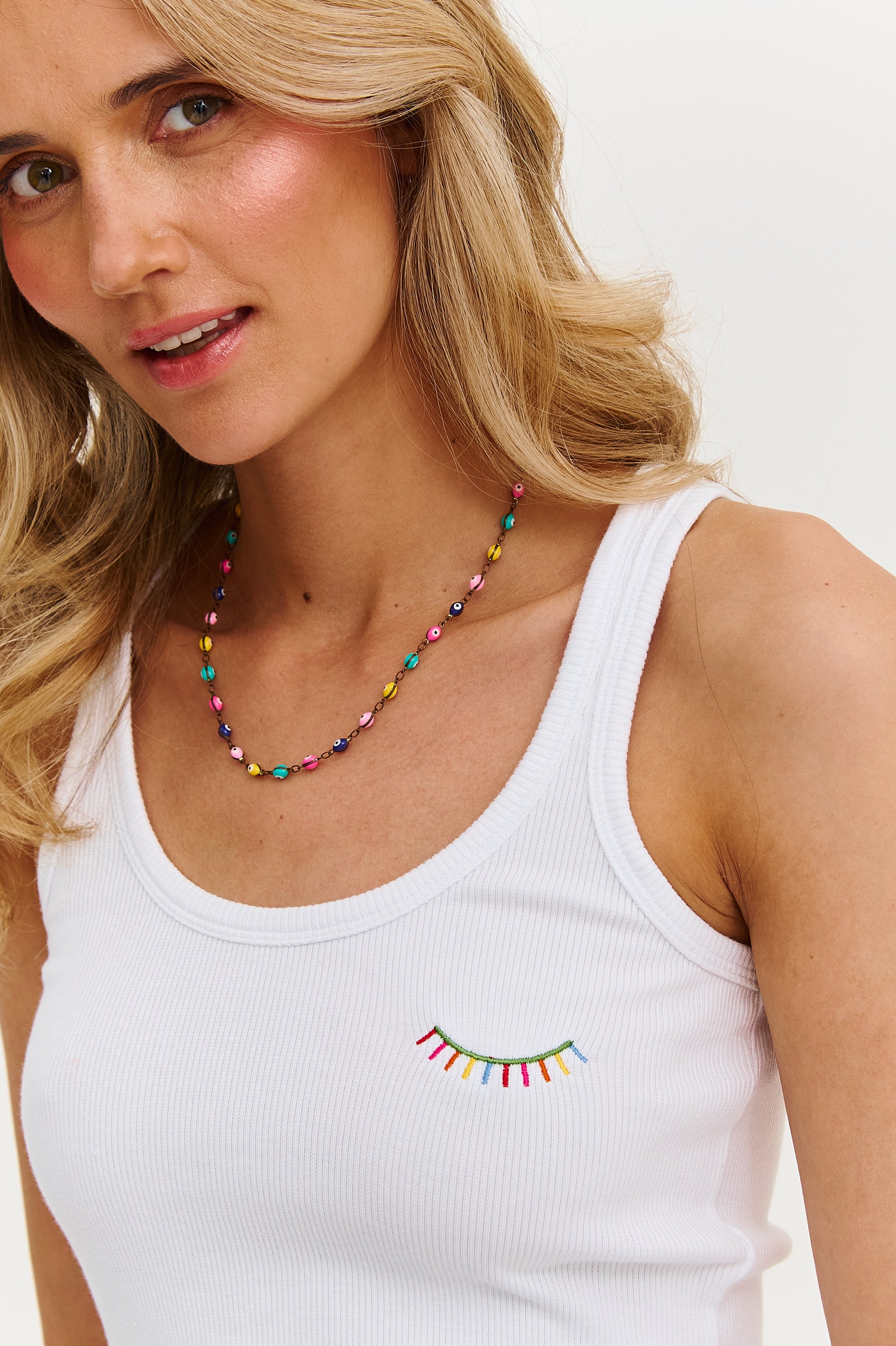 Top bokserka Color Revolution to kwintesencja letniej swobody i zabawy kolorem. Wykonany z prążkowanego materiału, świetnie dopasowuje się do sylwetki i zapewnia komfort nawet w najgorętsze dni. Z przodu wyróżnia się haftowanym — symbolem pozytywnej energii, luzu i odrobiny wakacyjnego szaleństwa.