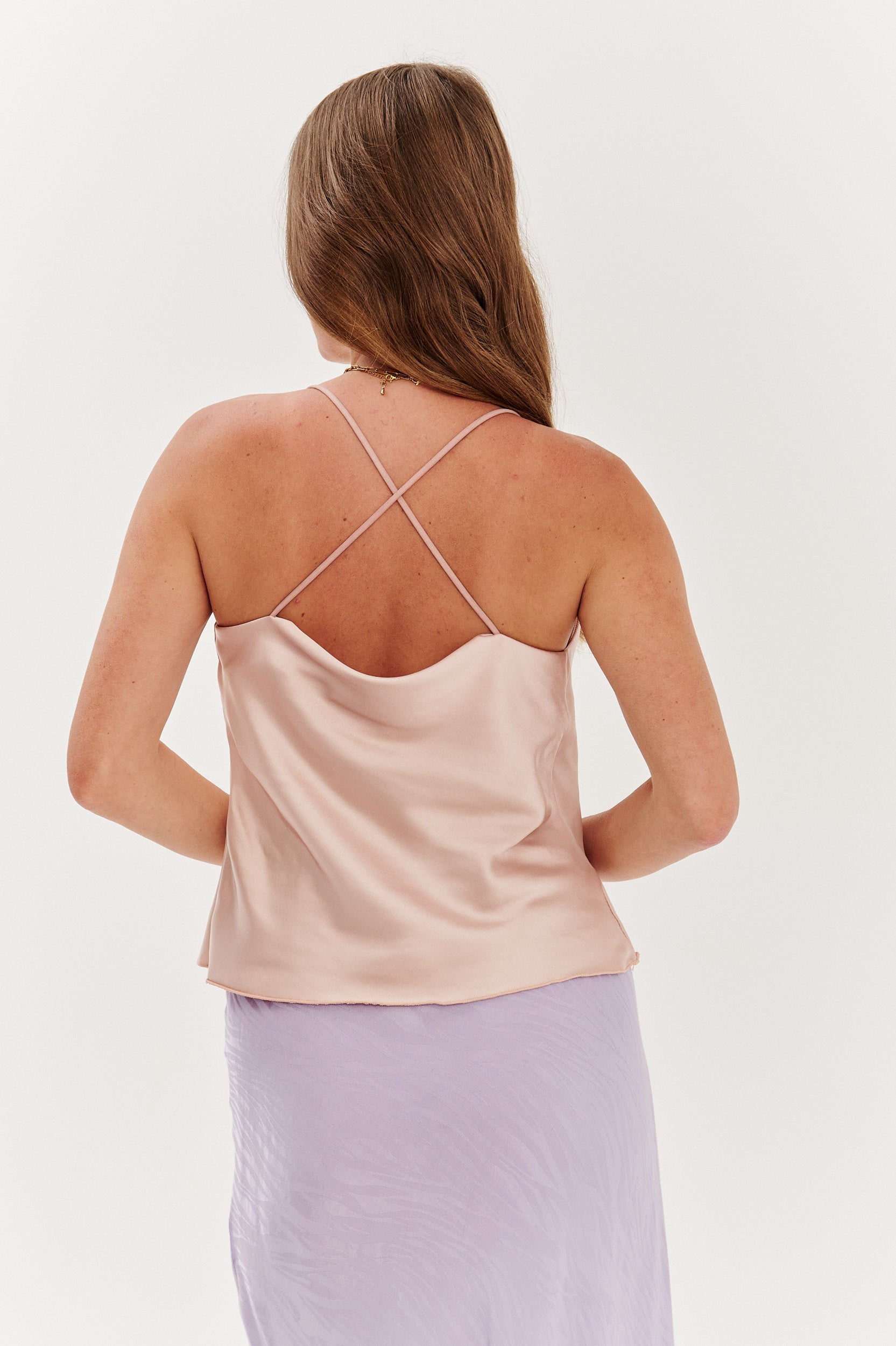 Model wyróżnia się drapowanym dekoltem oraz cienkimi ramiączkami, które krzyżują się z tyłu, tworząc efektowny detal. Luźny krój sprawia, że top swobodnie układa się na sylwetce, podkreślając kobiecość w subtelny sposób. To doskonała propozycja zarówno na co dzień, jak i na specjalne okazje.