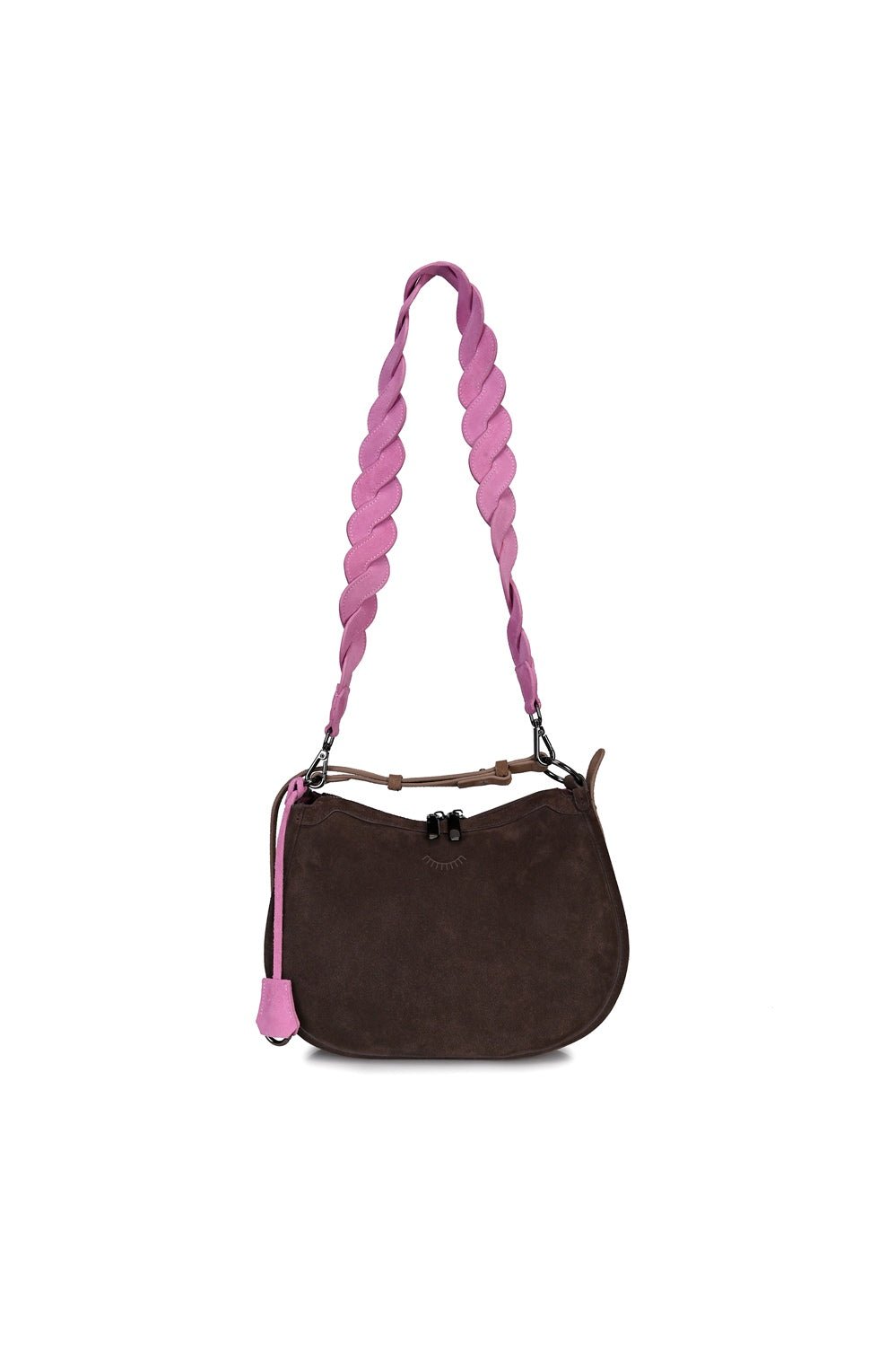 Model o kształcie półksiężyca jest niezwykle modny i wygodny. Posiada dwa paski do wyboru: długi, artystycznie pleciony, w kolorze różu oraz krótszy, z brązowej skóry. To idealny dodatek dla kobiety, która nie boi się koloru.