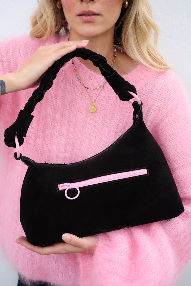 Różowy, kontrastowy zamek błyskawiczny z tyłu oraz akcenty przy mocowaniu paska dodają torebce nowoczesnego, odważnego wyglądu. Krótki, pleciony uchwyt jest wygodny i stylowy. To idealny dodatek, by ożywić czarny total look.