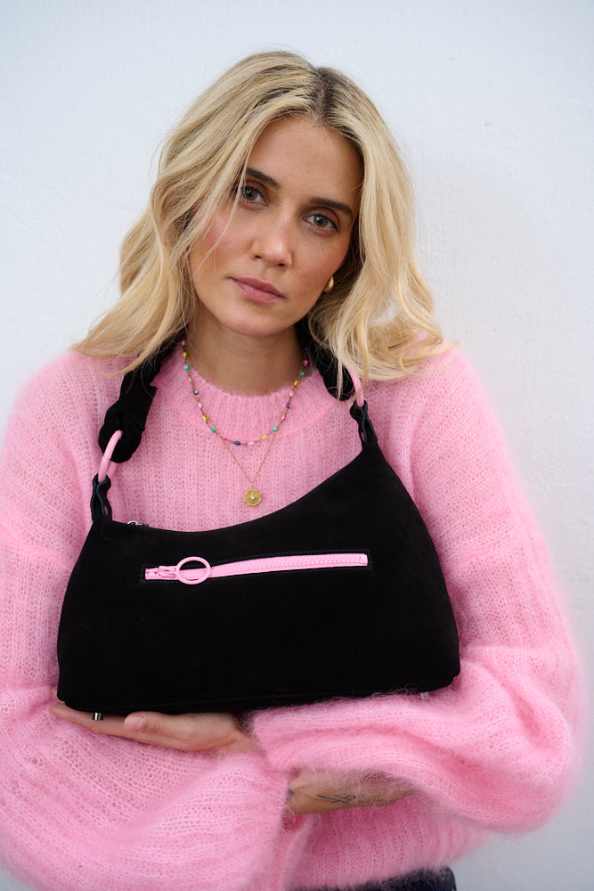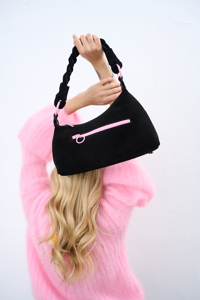 Torebka zamszowa Rebel Pink to idealny wybór dla kobiety, która lubi przełamywać schematy. Ponadczasowa, czarna torebka o kroju półksiężyca została wykonana z wysokiej jakości zamszu. Jej klasyczny charakter przełamują detale w kolorze pudrowego różu.