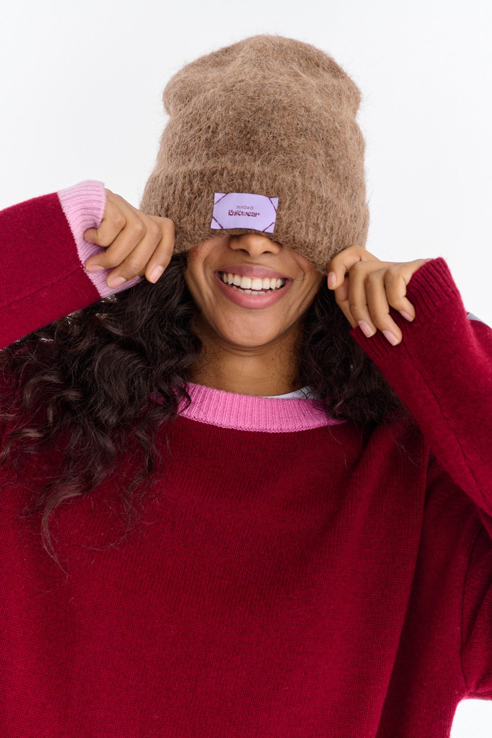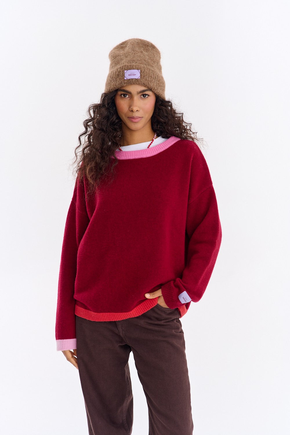 Wełniany sweter Good Vibrations to esencja jesiennej palety barw. Głęboki, bordowy kolor swetra pięknie komponuje się z różową lamówką przy dekolcie oraz jaśniejszym, koralowym wykończeniem rękawów i dołu. To prosty sposób na dodanie koloru do stonowanych, jesiennych stylizacji.