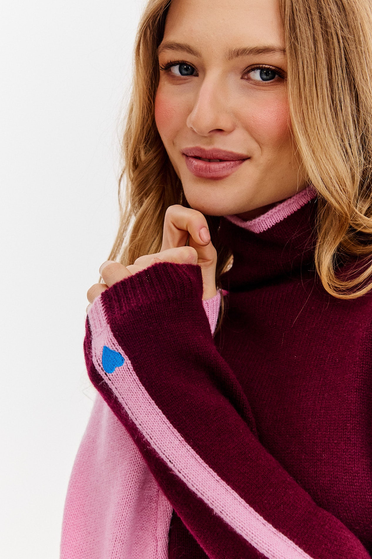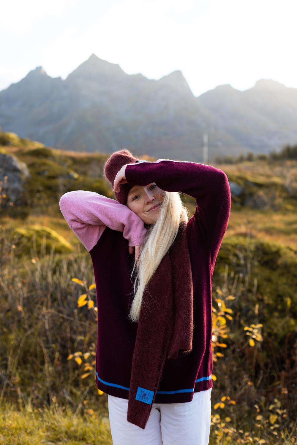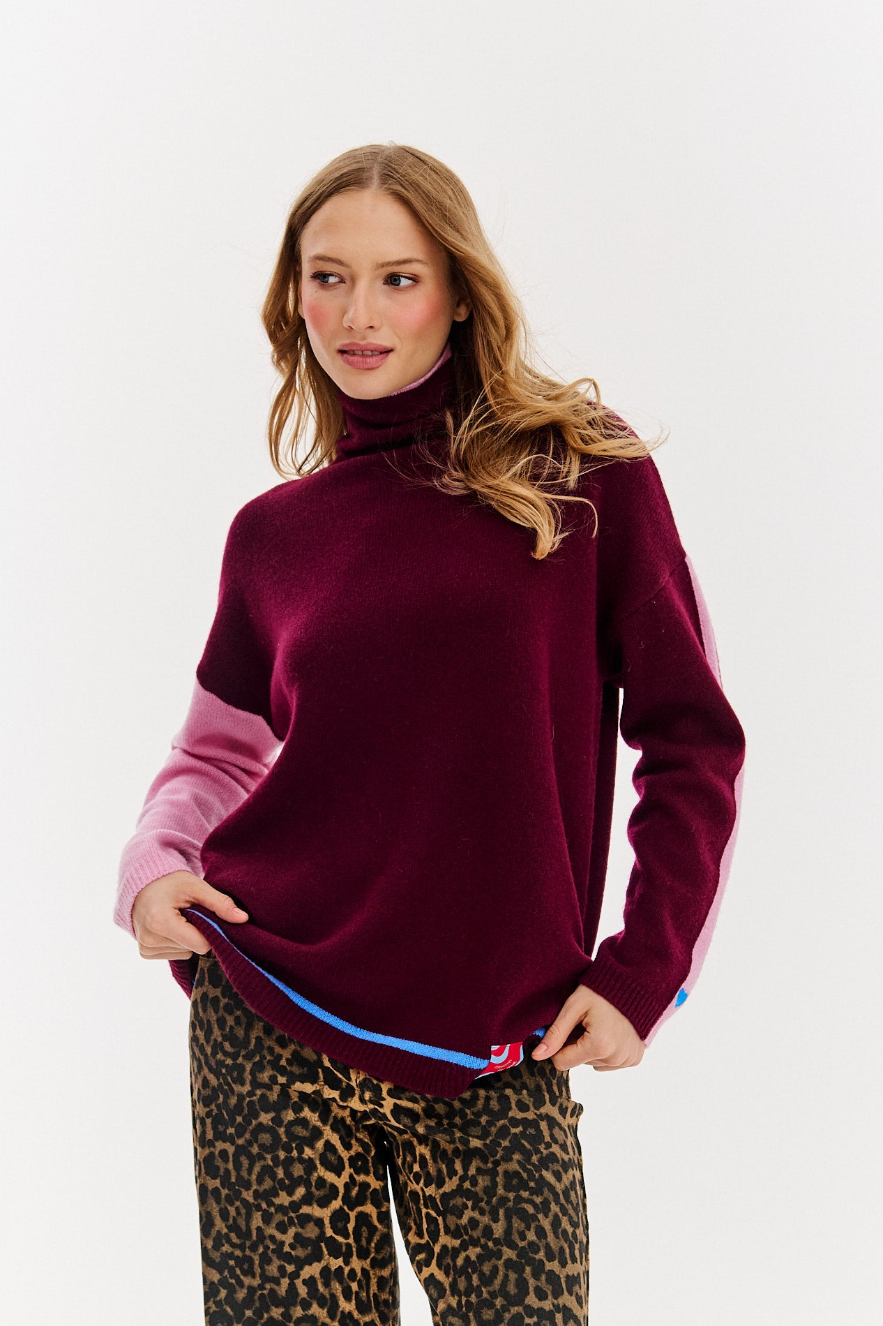 Dzięki połączeniu głębokiego bordo z różowymi wstawkami Rose Whisper świetnie sprawdzi się zarówno w stylizacjach casualowych, jak i bardziej eleganckich zestawach. Noś go z szerokimi spodniami lub ulubioną spódnicą, by podkreślić swój unikalny styl. Idealny do pracy, na spacer czy weekendowy wypad – ten model stanie się Twoim ulubionym jesienno-zimowym swetrem.