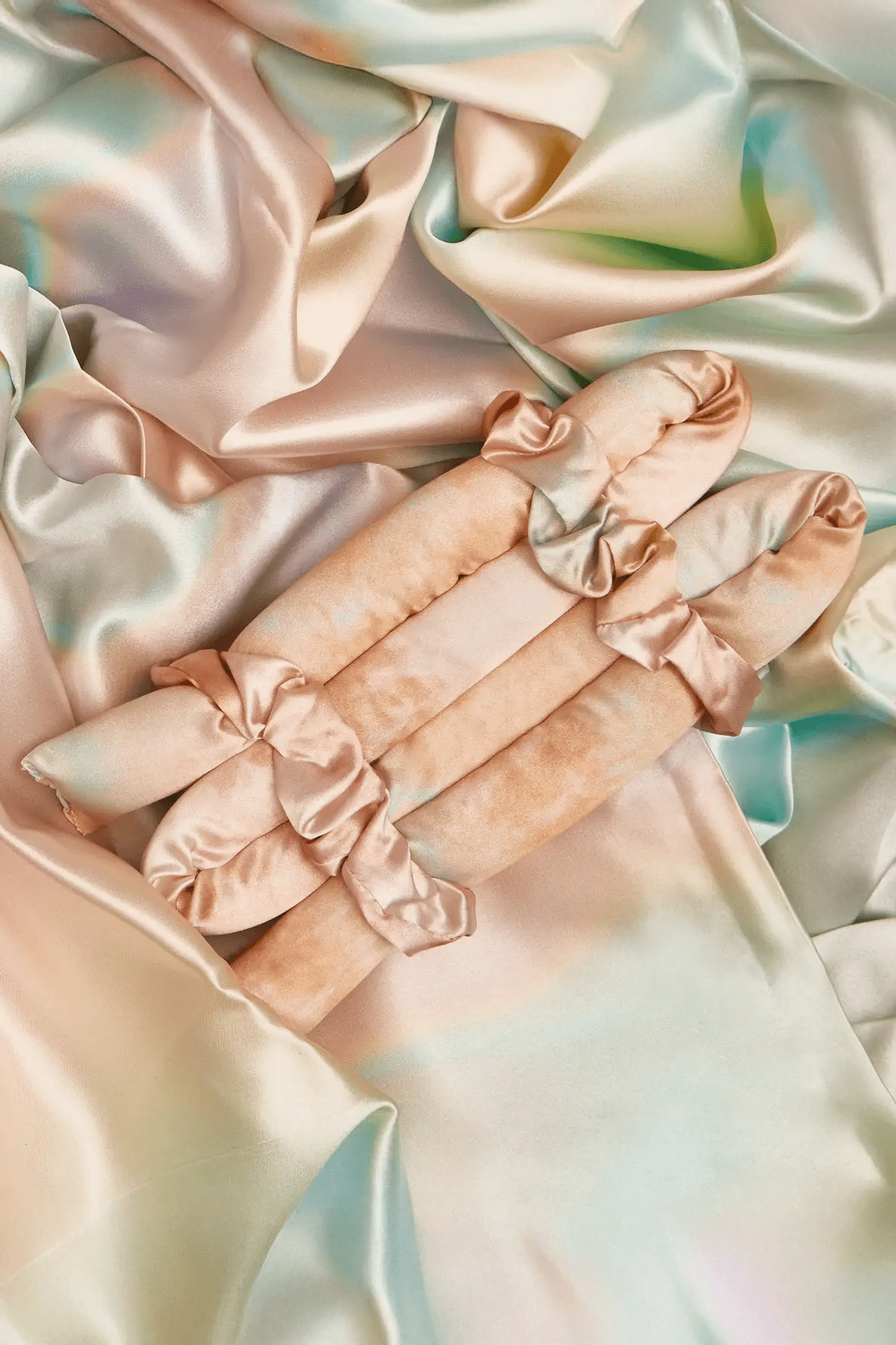 Zestaw do loków Sunset Tie Dye to idealne rozwiązanie dla każdej kobiety, która marzy o bujnych lokach, ale dba o kondycję swoich włosów. Jedwabiście gładki materiał wałka jest niezwykle delikatny – zapobiega tarciu, puszeniu się i łamaniu włosów podczas snu.