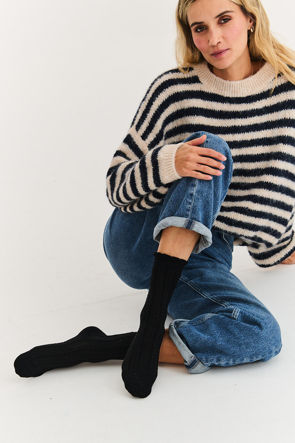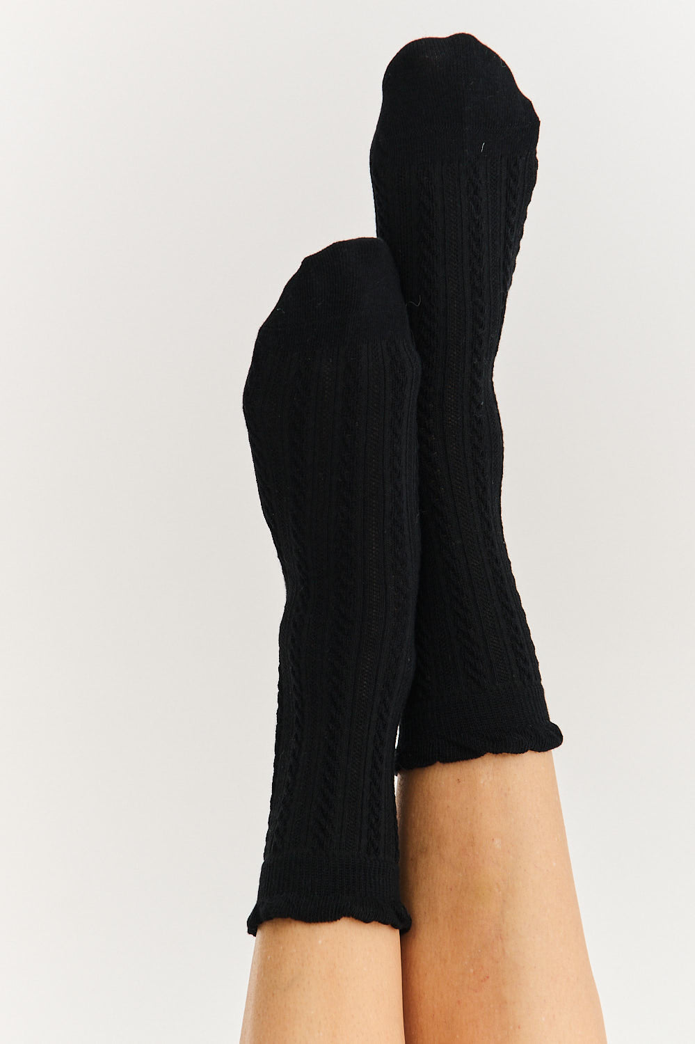 Zestaw skarpetek z falbanką Soft Intention to idealny dodatek do jesiennych botków. W zestawie otrzymujesz dwie pary: gładkie czarne oraz ażurowe w kolorze beżowym. Obie zakończone są elastyczną, dziewczęcą falbanką.