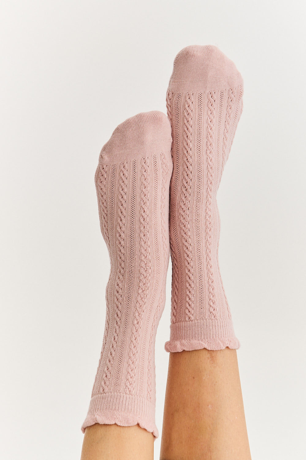 Skarpety wykonane są z wysokiej jakości bawełnianej dzianiny, co gwarantuje wygodę i przewiewność. Ażurowy splot nadaje lekkości i romantycznego charakteru. To idealny sposób, by dodać prostym stylizacjom odrobinę fantazji.