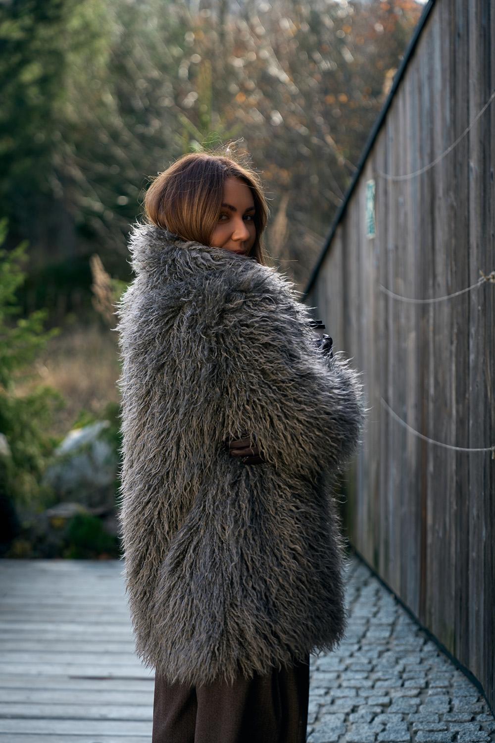 Kurtka ze sztucznego futerka Shadow to eleganckie okrycie wierzchnie o miękkiej, puszystej strukturze, które dodaje stylizacji głębi i luksusowego charakteru. Jej stonowany, ciemny odcień stanowi idealne tło dla delikatnych detali sukienki, a jednocześnie zapewnia komfort i ciepło w chłodniejsze wieczory. To element, który podkreśla wieczorowy charakter zestawu bez przytłaczania całości.