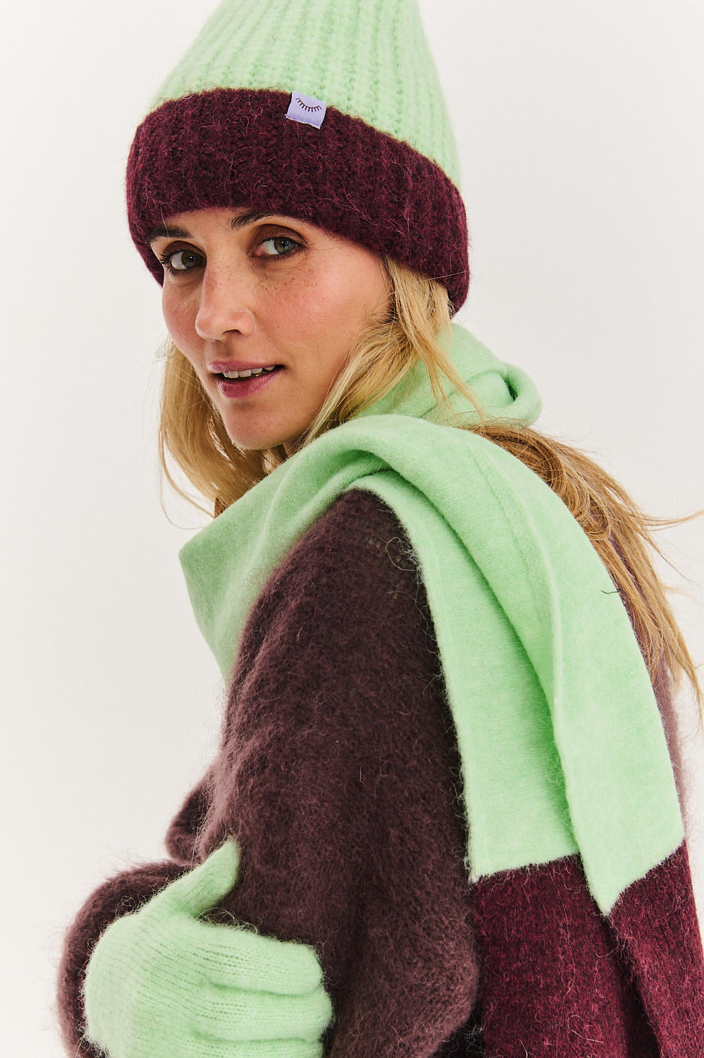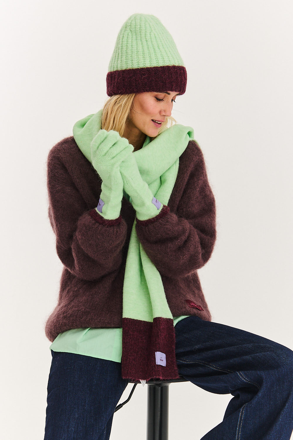Ten zimowy komplet jest nie tylko ciepły, ale także stylowy. Niecodzienne połączenie kolorów świeżej limonki i głębokiego bordo przykuwa uwagę i ożywia stylizację.