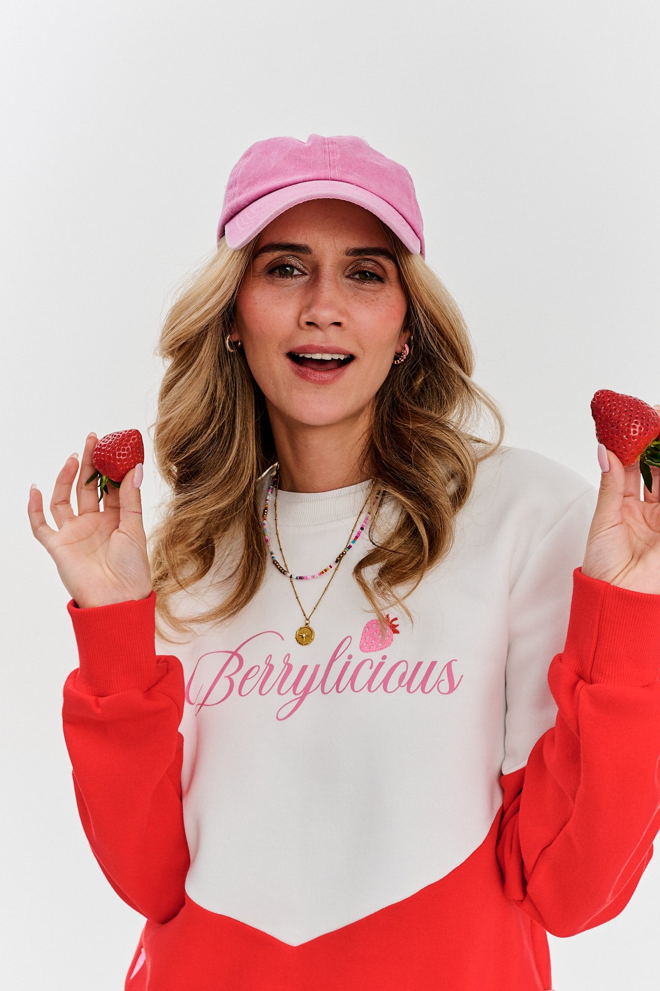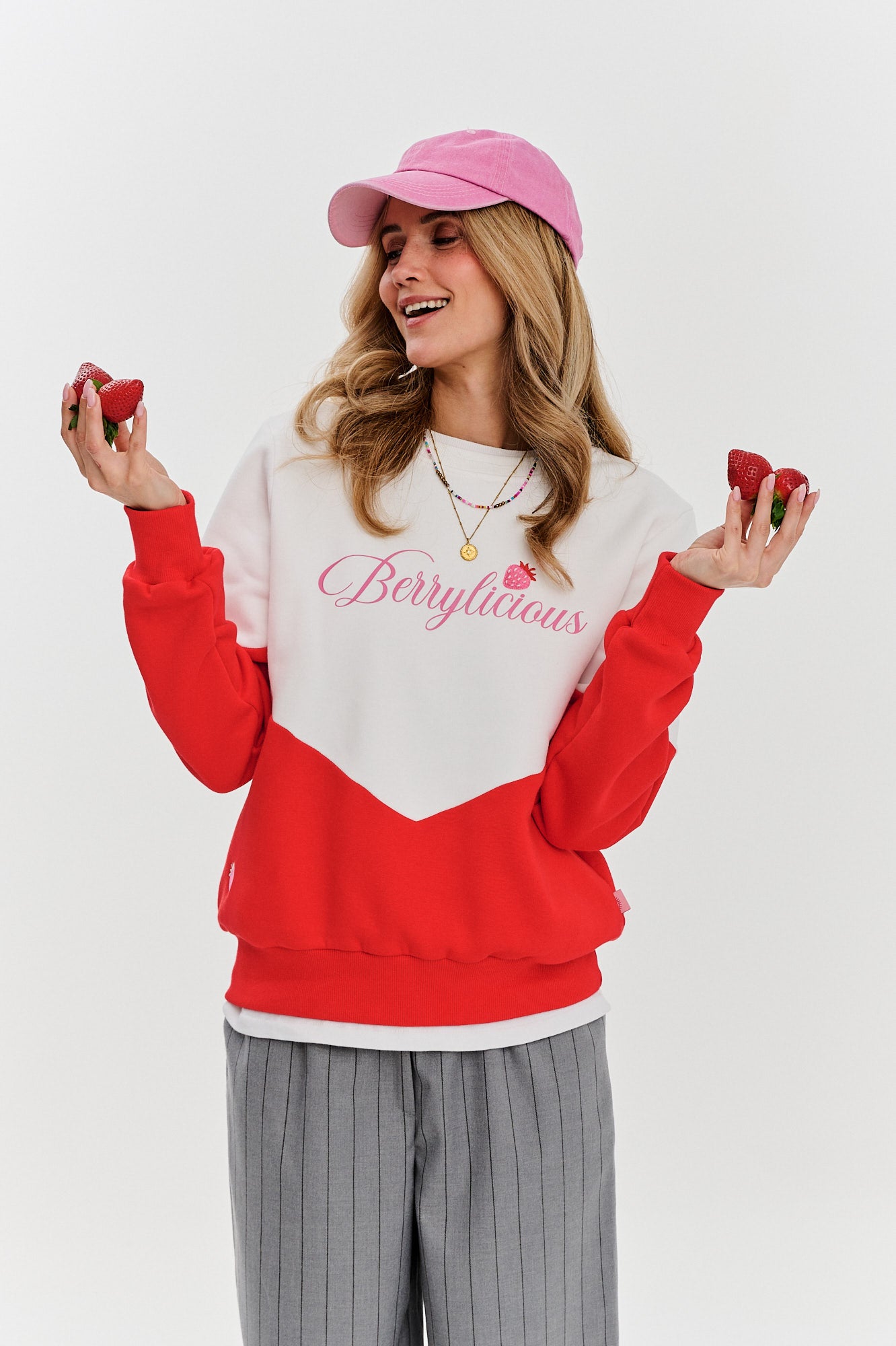 Bluza Berrylicious Fragola to owocowy zastrzyk energii, który wnosi do stylizacji świeżość i dziewczęcy urok. Dwukolorowe połączenie kremowej bieli i soczystej czerwieni tworzy wyrazisty kontrast, który podkreśla dynamiczny charakter bluzy. Subtelny napis „Berrylicious” z haftowanym motywem truskawki dodaje jej słodkiego, ale jednocześnie stylowego wyrazu.