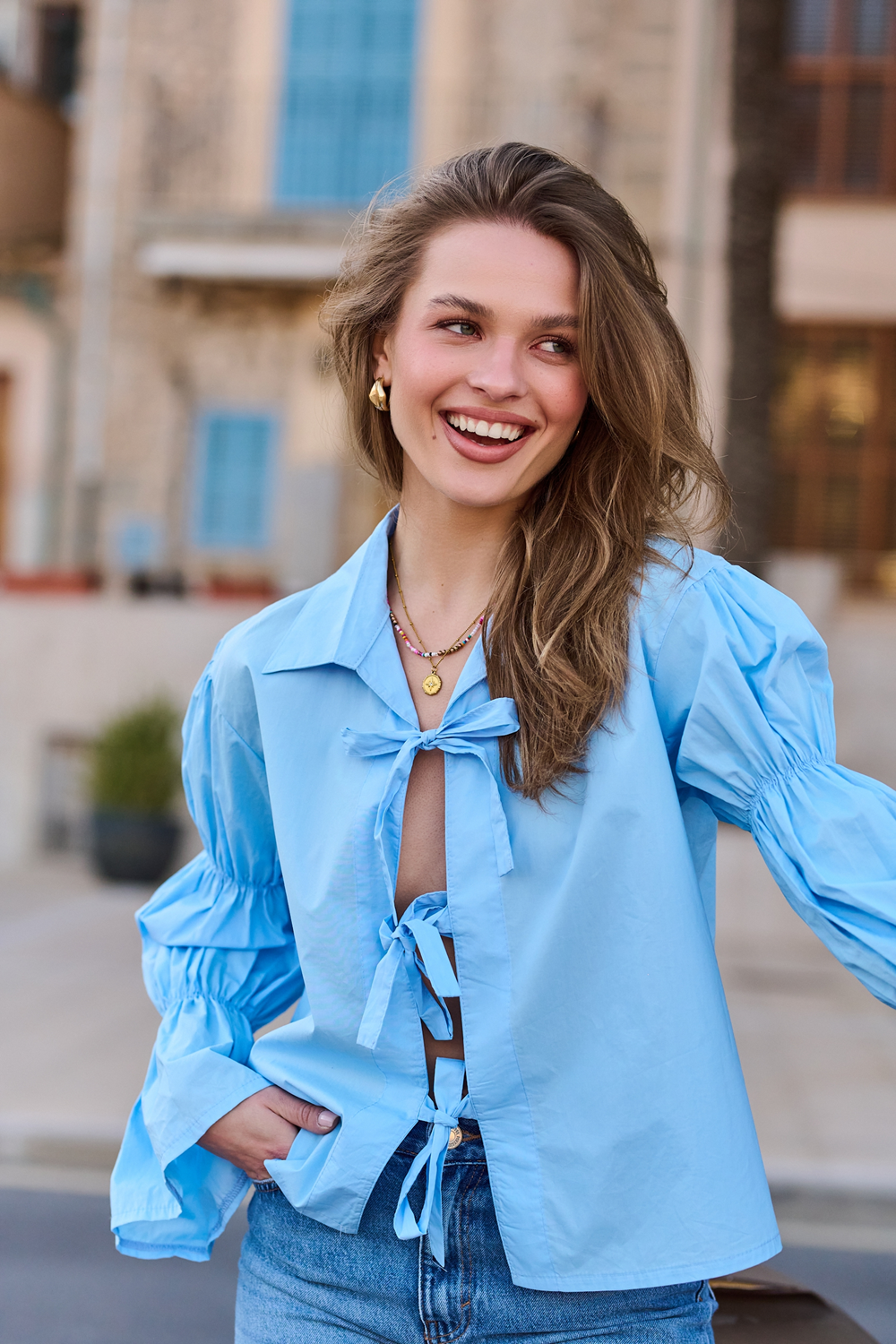 Koszula Blue Cloud to połączenie nonszalancji i dziewczęcego wdzięku. Jej unikalny fason z szerokim kołnierzem i wiązaniami z przodu nadaje lekko retro charakter, a marszczone rękawy zakończone falbaną przyciągają wzrok i nadają całości wyjątkowego charakteru. Wykonana z lekkiej bawełny w odcieniu czystego nieba – nosisz ją i czujesz się, jakbyś unosiła się w chmurach.