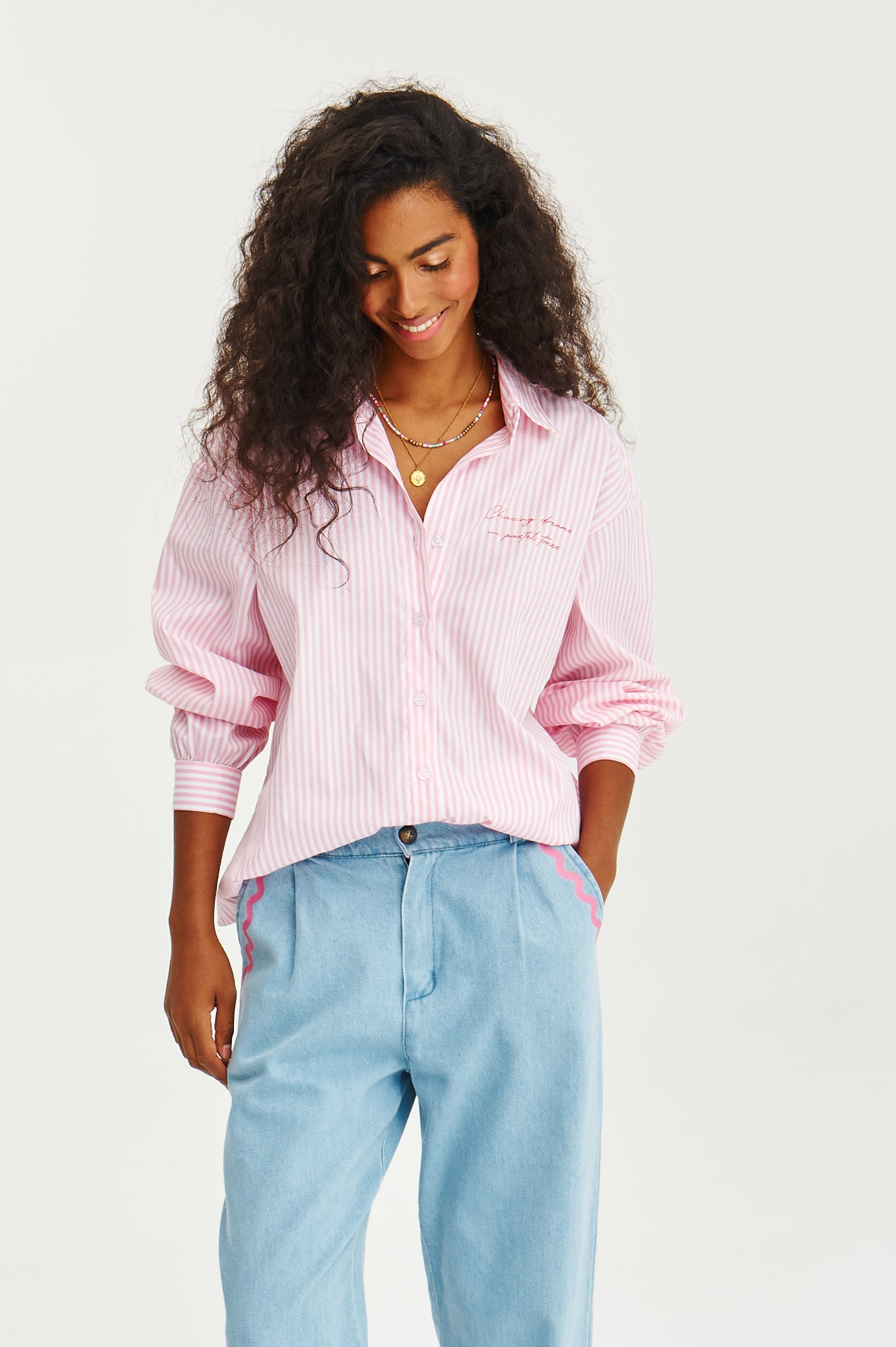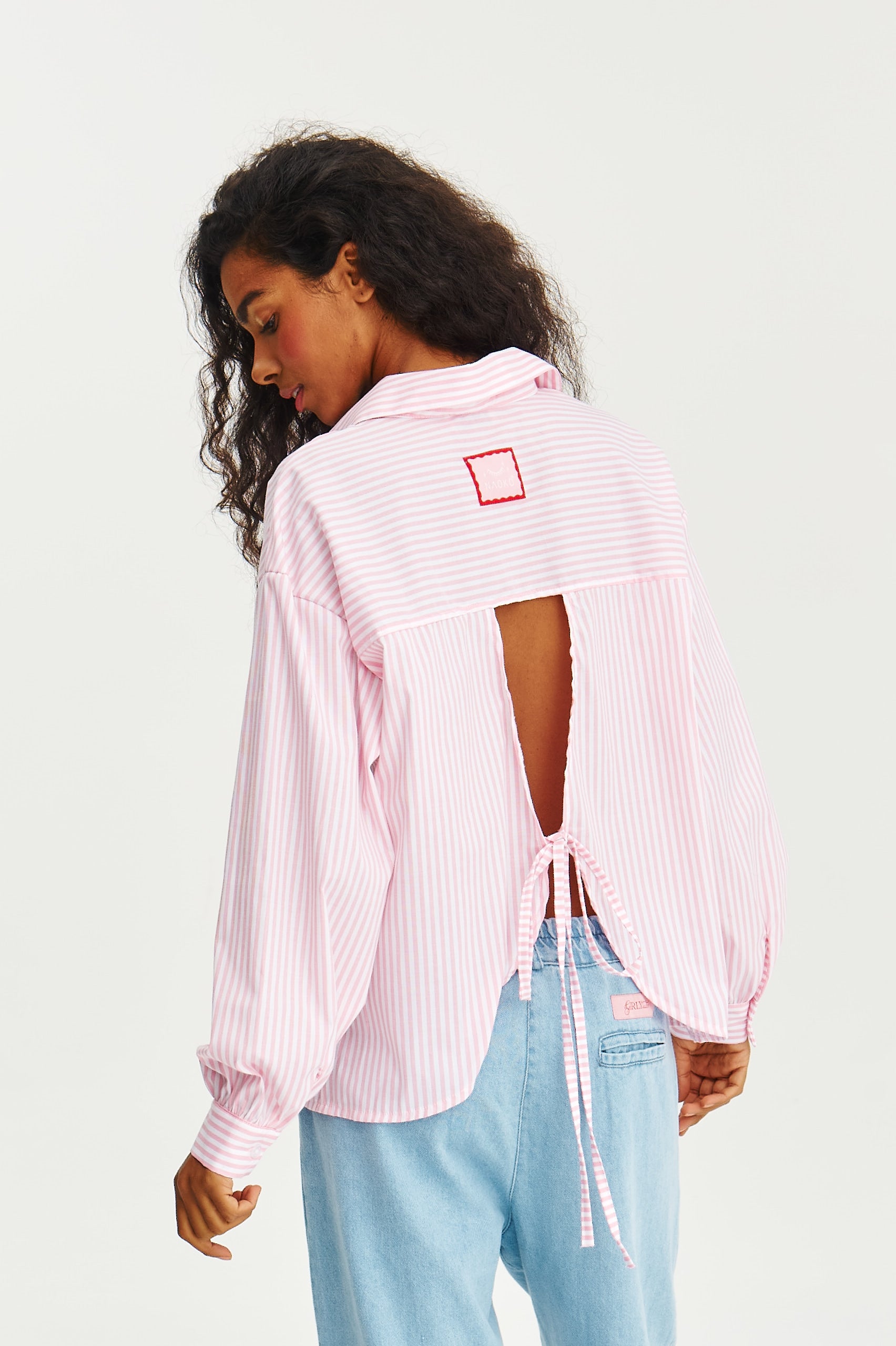 Z pozoru klasyczna, w rzeczywistości zaskakująco inna – koszula z rozcięciem na plecach Sweetheart to propozycja, która nie boi się wyróżniać. Różowo-białe paski i nonszalancki krój przywodzą na myśl francuski szyk, a rozcięcie na plecach z wiązaniem dodaje odważnego, kobiecego akcentu. To koszula dla tych, które lubią balansować pomiędzy klasyką a modową swobodą.
