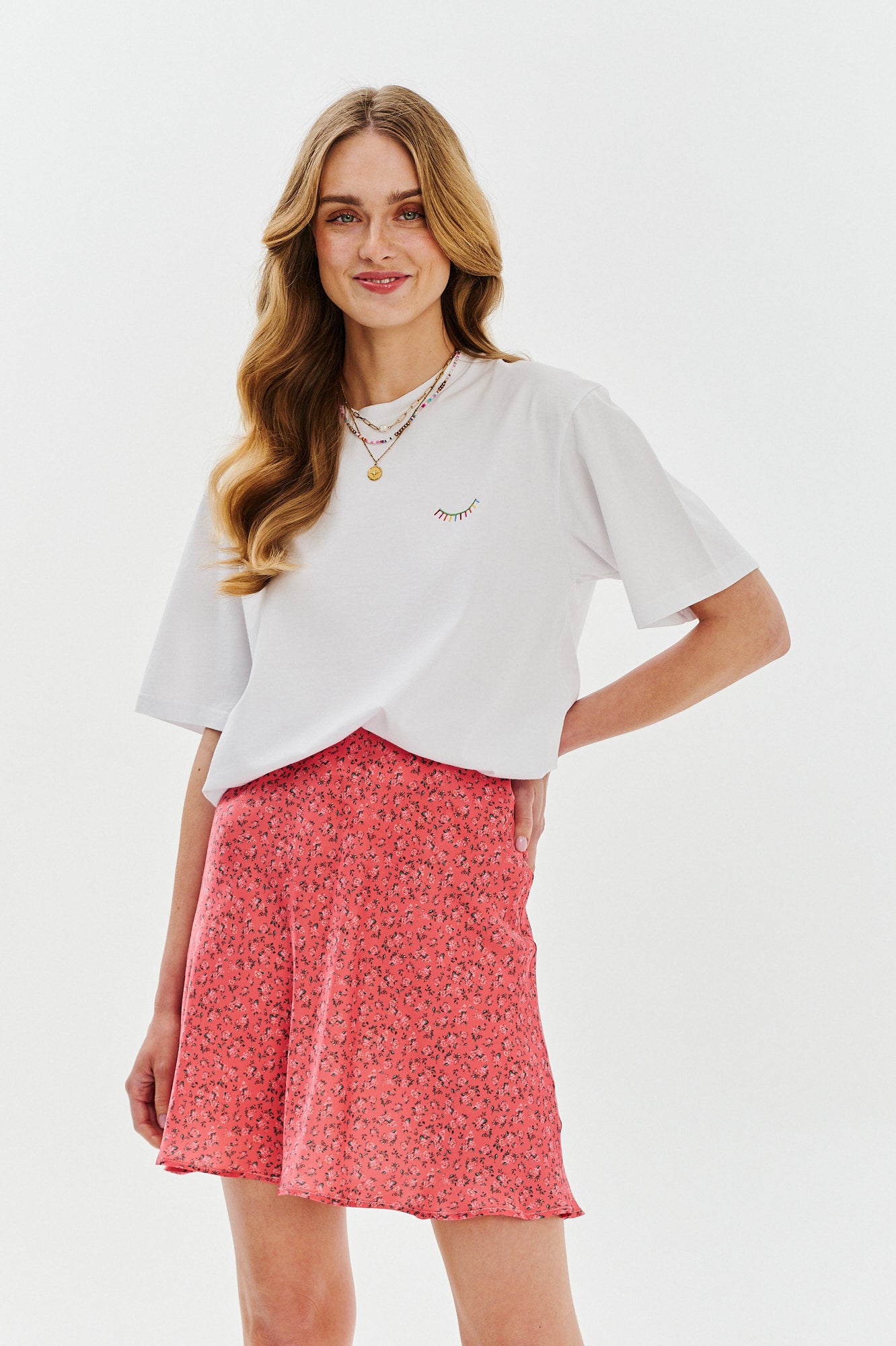 Spódniczka mini Sweet Rosalia to kwintesencja dziewczęcego uroku zamknięta w lekkiej, zwiewnej formie. Uszyta z delikatnej wiskozy, subtelnie układa się na sylwetce i porusza z każdym krokiem, nadając Twoim ruchom wyjątkowej lekkości. Jej różowy print w drobne kwiatuszki wprowadza w nastrój beztroskich dni i słonecznych poranków. Dzwonkowy krój pięknie podkreśla talię i wysmukla nogi, a długość mini dodaje całości odrobiny zalotności.