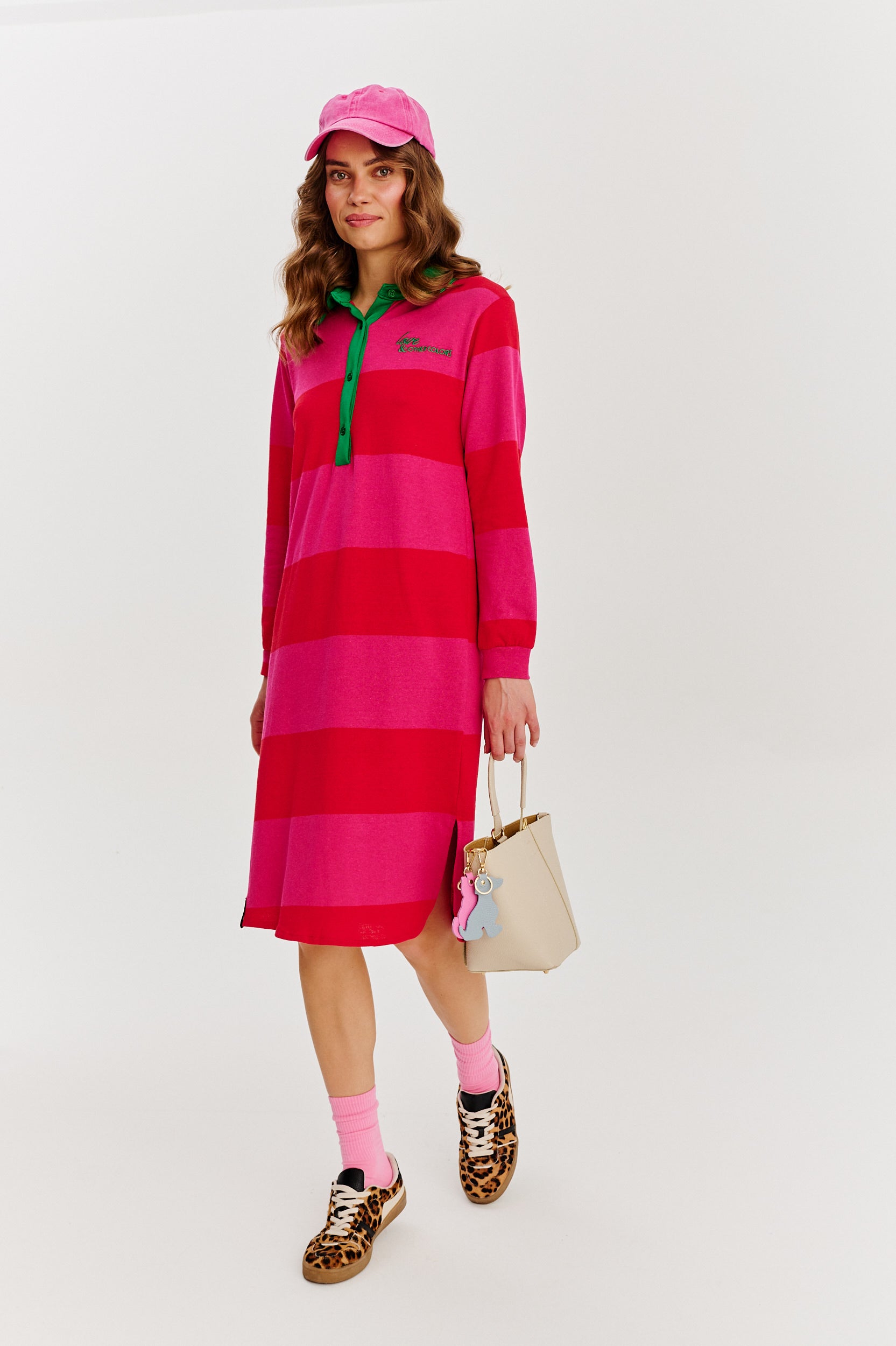 Sukienka dzianinowa polo No Limits to propozycja dla kobiet, które lubią wyraziste kolory i sportowy luz w modnym wydaniu. Intensywne pasy w odcieniach fuksji i czerwieni dodają energii i wyróżniają się na tle klasycznych fasonów. Zielony kołnierzyk polo nadaje jej unikalnego charakteru, tworząc ciekawy kontrast z resztą sukienki.
