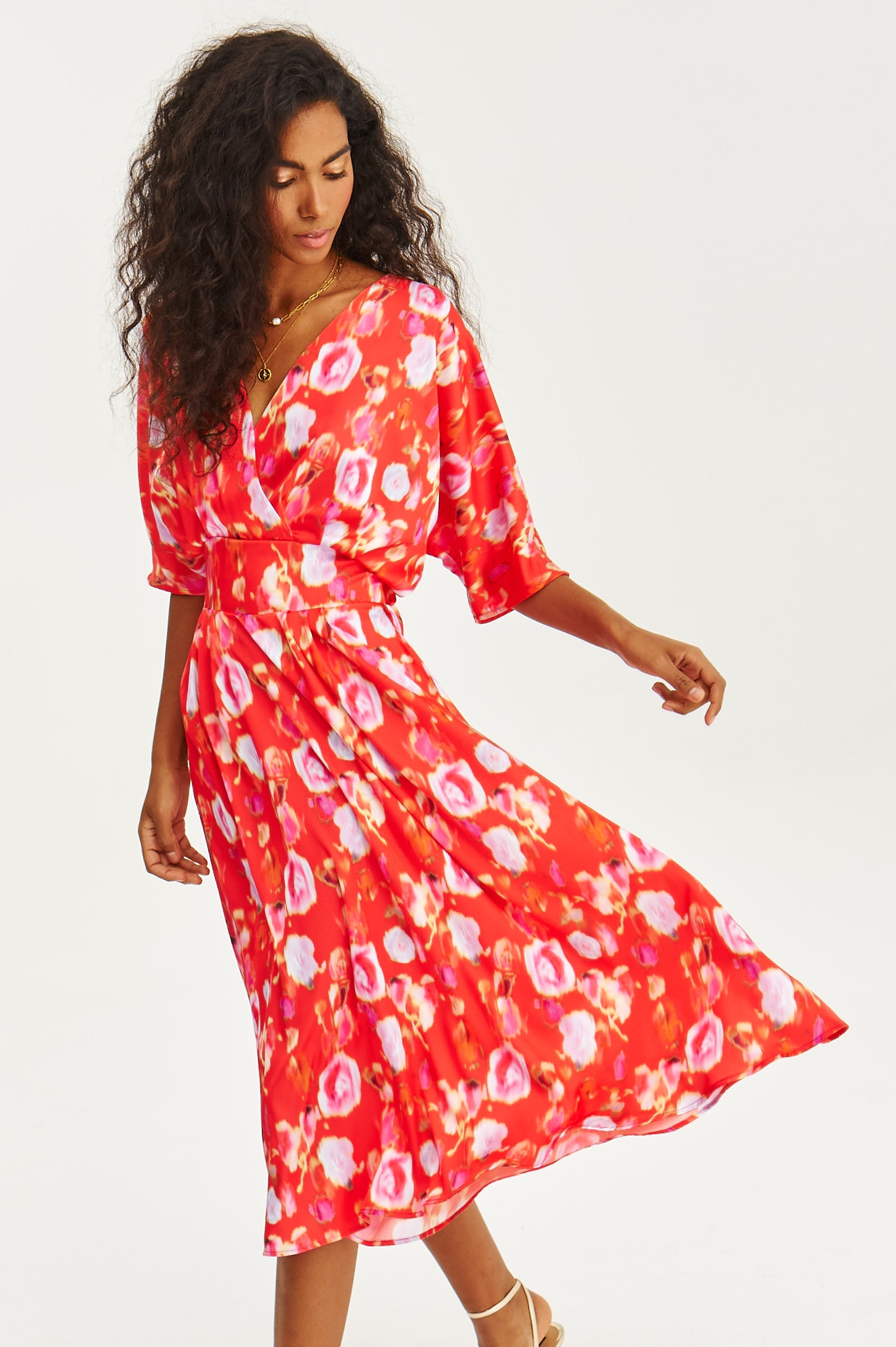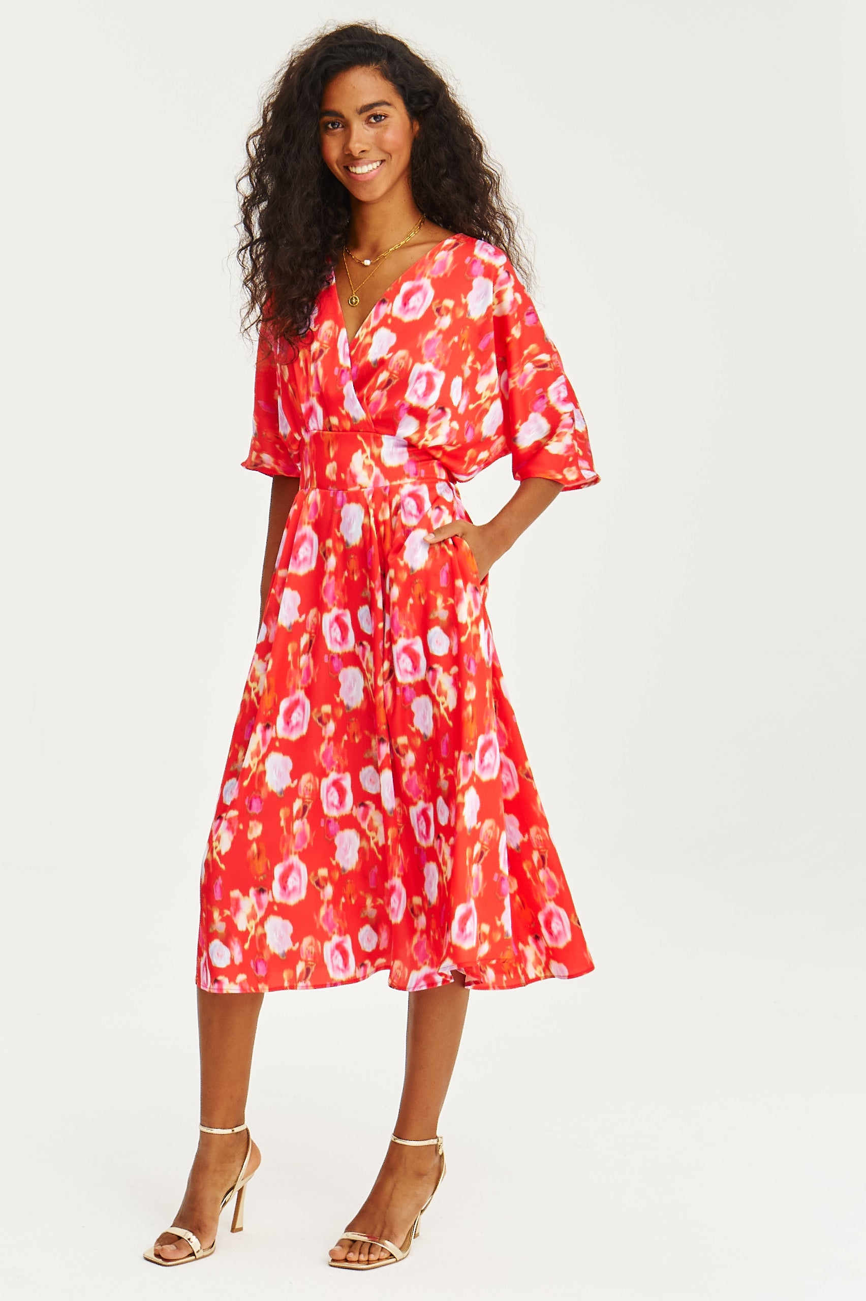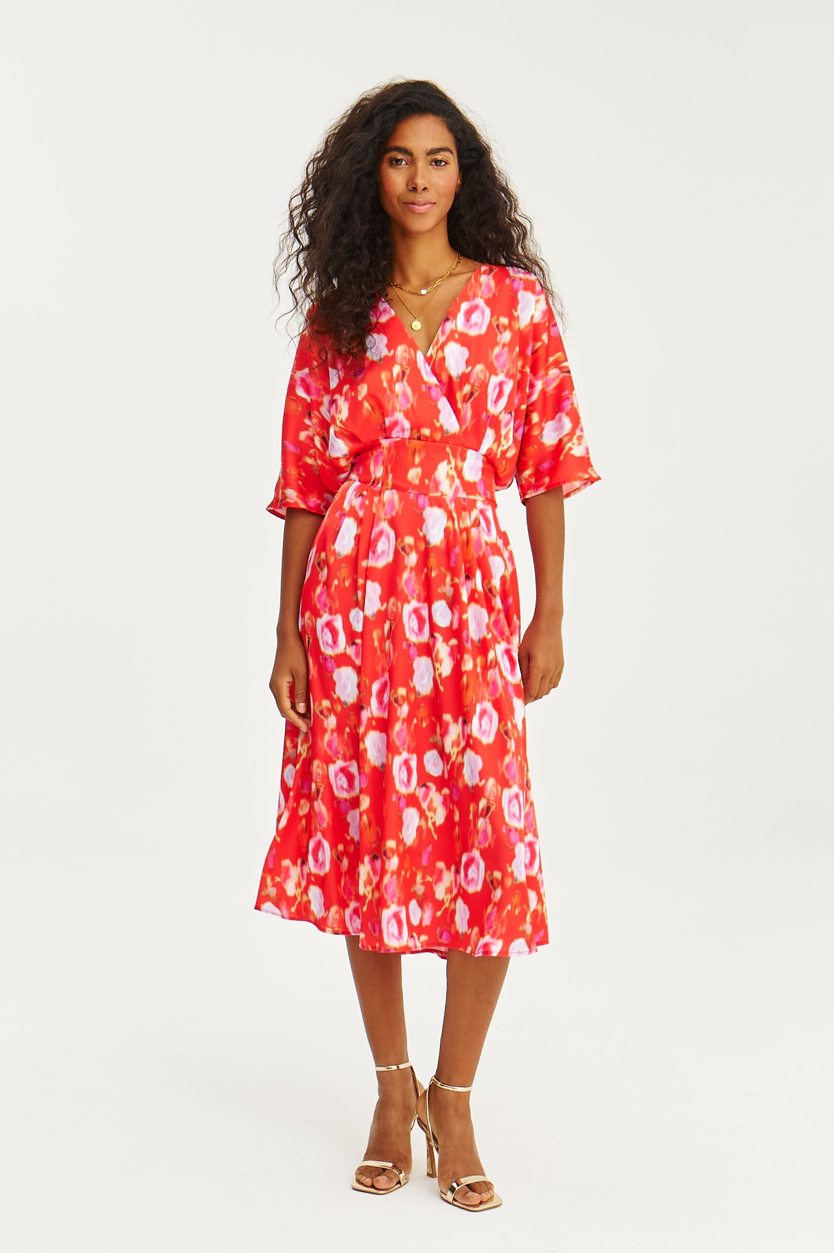 Artystyczna dusza w wersji midi – sukienka midi Watercolor Roses to propozycja, która wygląda jak namalowana akwarelą. Intensywna czerwień tła połączona z rozmytym wzorem róż w odcieniach różu, bieli i fioletu tworzy efekt subtelnej romantyczności z mocnym, wyrazistym akcentem.