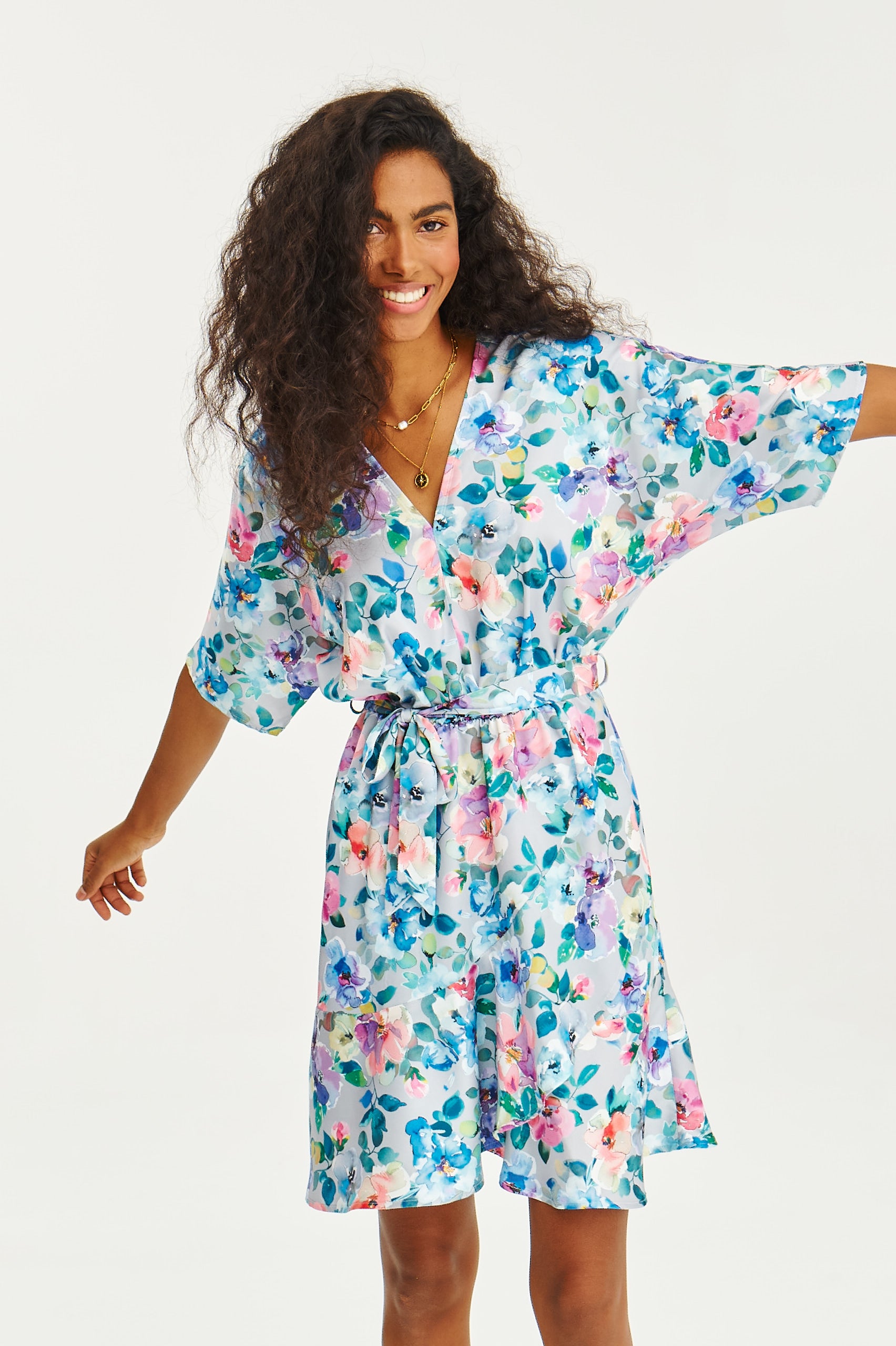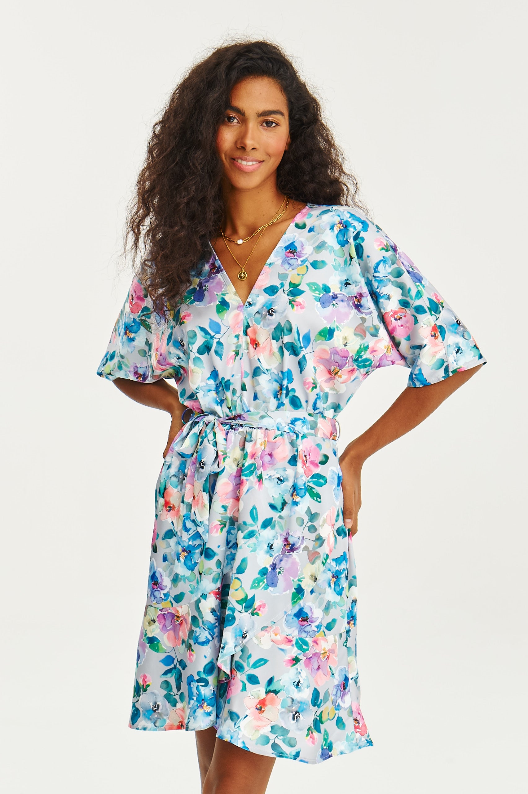 Zanurz się w zapachu jaśminu i promieniach toskańskiego słońca! Sukienka mini Italian Garden to esencja letniego uroku zamknięta w kobiecej formie. Kwiatowy print przywodzi na myśl ogród w pełnym rozkwicie, a lekki krój z kopertowym wiązaniem w talii podkreśla sylwetkę, zapewniając przy tym wygodę i swobodę ruchu.