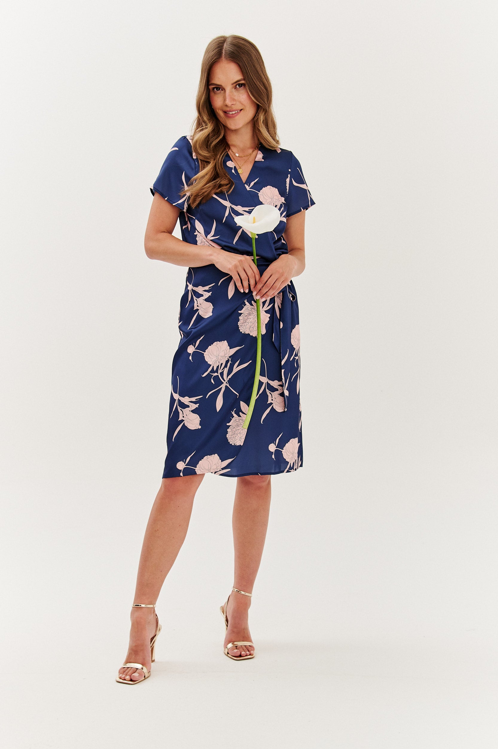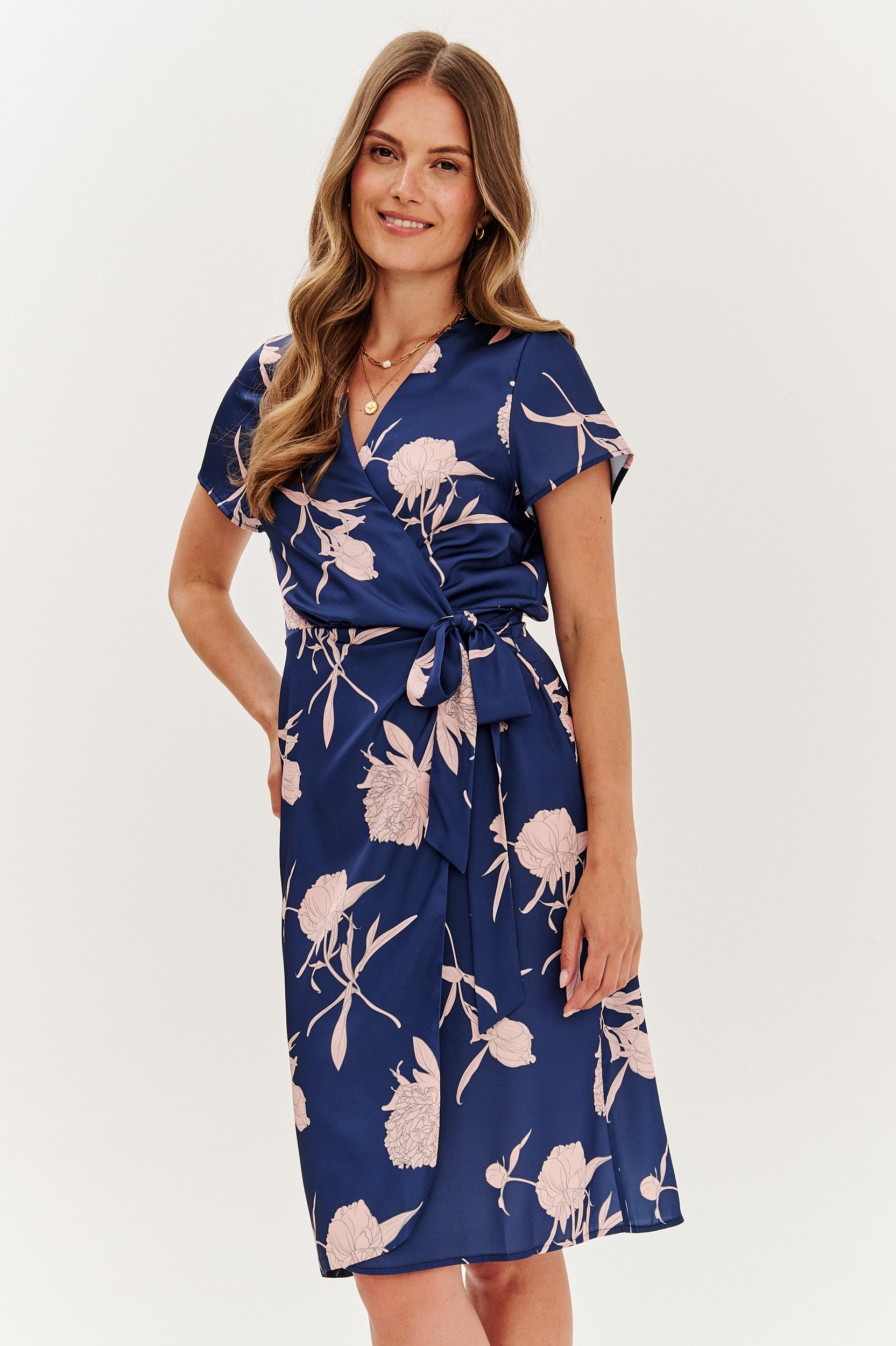 Sukienka multiway midi Milano Moves to elegancja w lekkim, codziennym wydaniu. Granatowa baza i pudrowy kwiatowy wzór tworzą ponadczasowe połączenie, które sprawdzi się zarówno na większe okazje, jak i w codziennych stylizacjach. Dzięki wiązaniu w talii dopasowuje się do sylwetki, a miękka wiskoza zapewnia wygodę przez cały dzień.
