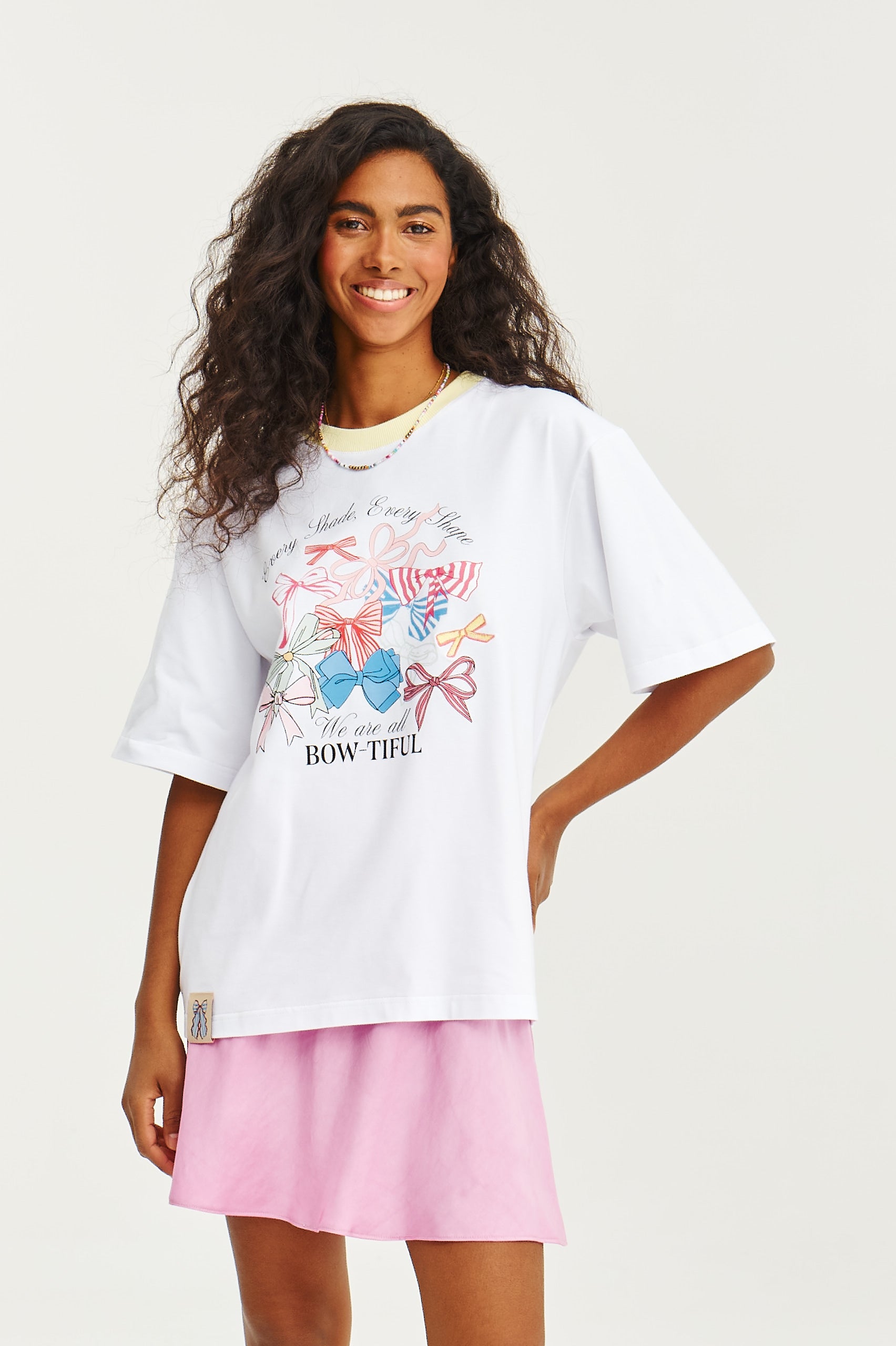 To coś więcej niż zwykła koszulka. To manifest radości, kobiecości i indywidualności. T-shirt Bow-Tiful zdobi haftowany bukiet kolorowych kokardek oraz prawdziwa, doszyta kokarda – detal, który nadaje projektowi trójwymiarowy, biżuteryjny efekt. Wzór opatrzony hasłem "Every Shade. Every Style. We are all BOW-TIFUL" przypomina, że różnorodność to nasza siła.